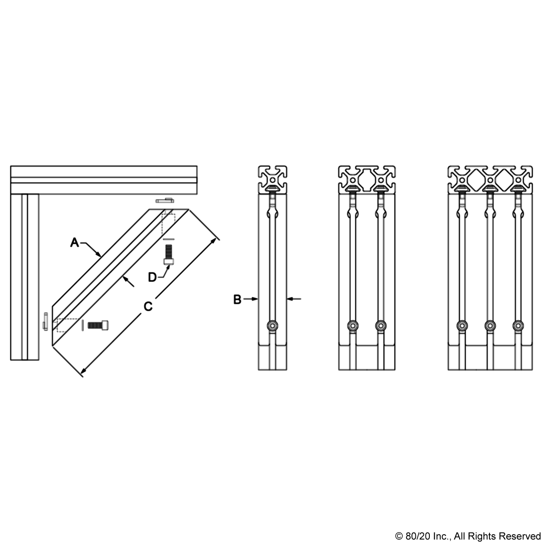 THE 45 DEGREE SUPPORT ASSEMBLY INCLUDES SOCKET HEAD CAP SCREWS, WASHERS AND T-NUTS. THE SUPPORT ASSEMBLY IS PRE-MACHINED WITH COUNTERBORES AND A 45 DEGREE MITER ANGLE ON BOTH ENDS. THIS FASTENING METHOD PROVIDES A CLEAN, FLUSH CONNECTION AND IS TYPICALLY USED TO REINFORCE A 90 DEGREE CONNECTION. THIS CONNECTION LENDS ITSELF TO APPLICATIONS WITH HEAVY LOADS TO MINIMIZE BEAM DEFLECTION.