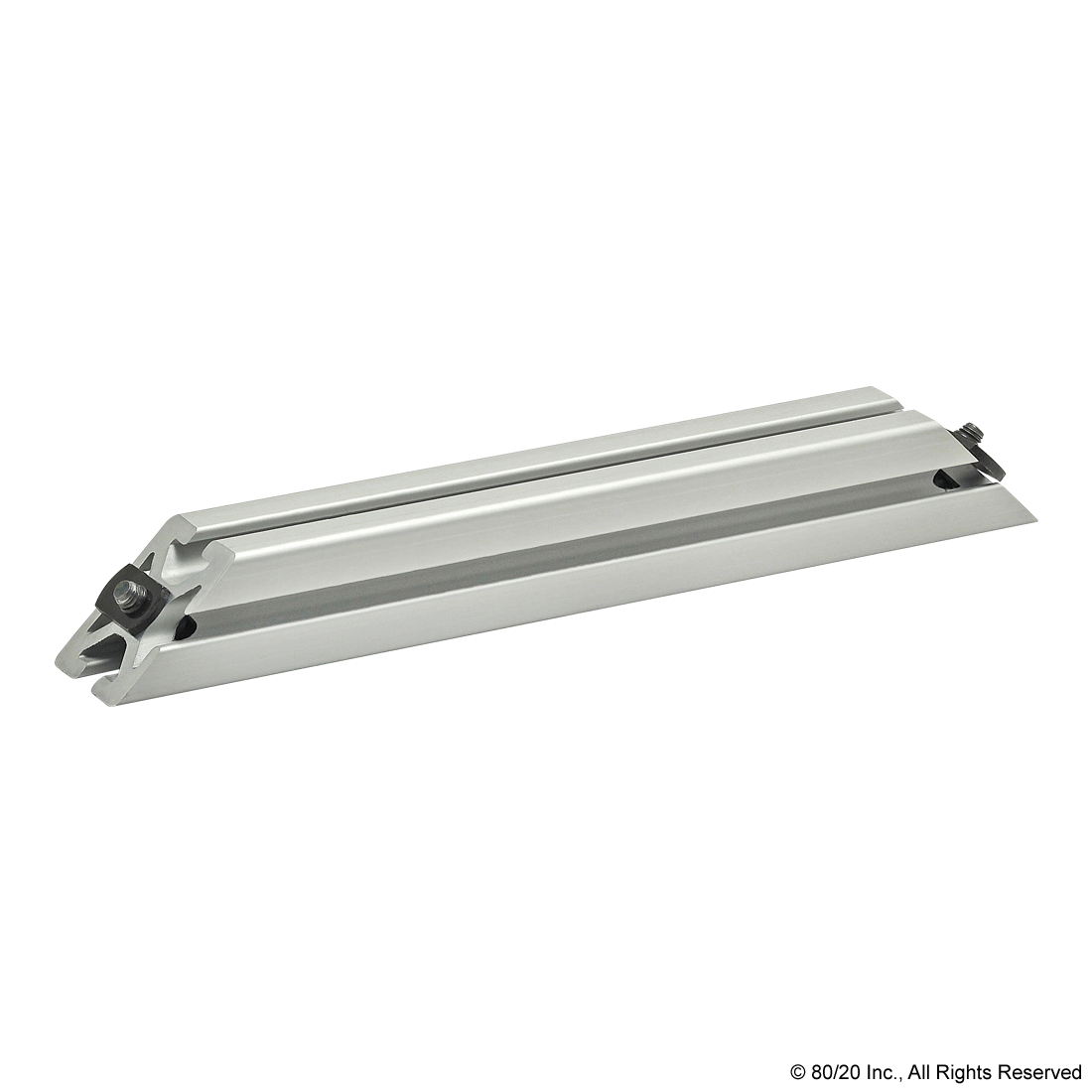 THE 45 DEGREE SUPPORT ASSEMBLY INCLUDES SOCKET HEAD CAP SCREWS, WASHERS AND T-NUTS. THE SUPPORT ASSEMBLY IS PRE-MACHINED WITH COUNTERBORES AND A 45 DEGREE MITER ANGLE ON BOTH ENDS. THIS FASTENING METHOD PROVIDES A CLEAN, FLUSH CONNECTION AND IS TYPICALLY USED TO REINFORCE A 90 DEGREE CONNECTION. THIS CONNECTION LENDS ITSELF TO APPLICATIONS WITH HEAVY LOADS TO MINIMIZE BEAM DEFLECTION.