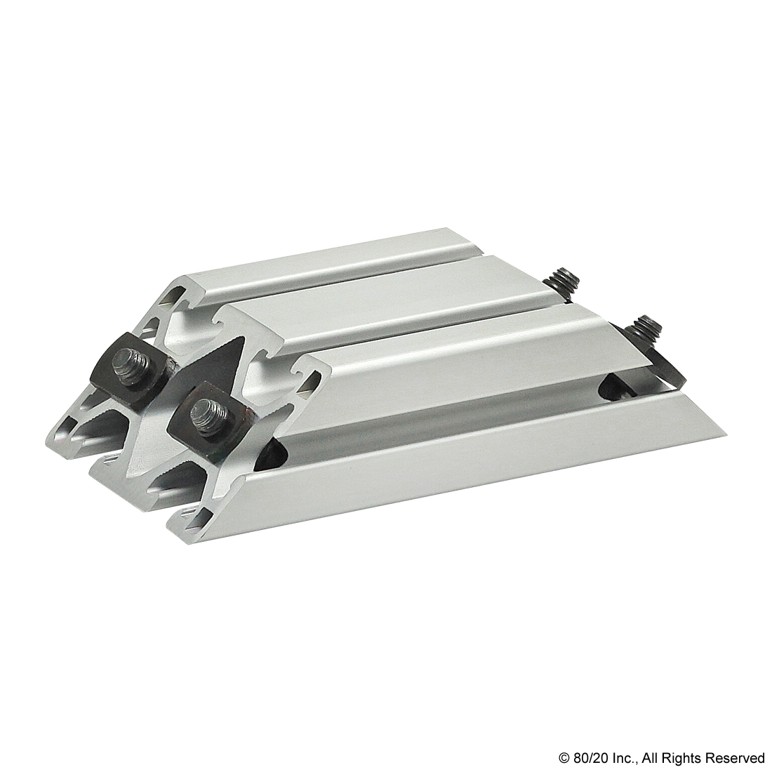 THE 45 DEGREE SUPPORT ASSEMBLY INCLUDES SOCKET HEAD CAP SCREWS, WASHERS AND T-NUTS. THE SUPPORT ASSEMBLY IS PRE-MACHINED WITH COUNTERBORES AND A 45 DEGREE MITER ANGLE ON BOTH ENDS. THIS FASTENING METHOD PROVIDES A CLEAN, FLUSH CONNECTION AND IS TYPICALLY USED TO REINFORCE A 90 DEGREE CONNECTION. THIS CONNECTION LENDS ITSELF TO APPLICATIONS WITH HEAVY LOADS TO MINIMIZE BEAM DEFLECTION.