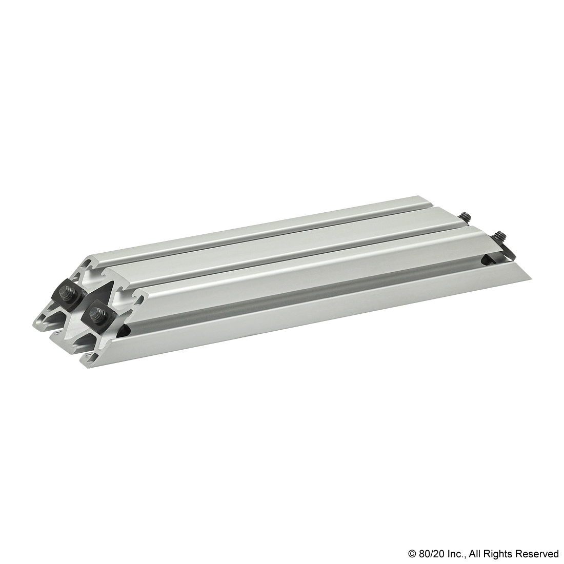 THE 45 DEGREE SUPPORT ASSEMBLY INCLUDES SOCKET HEAD CAP SCREWS, WASHERS AND T-NUTS. THE SUPPORT ASSEMBLY IS PRE-MACHINED WITH COUNTERBORES AND A 45 DEGREE MITER ANGLE ON BOTH ENDS. THIS FASTENING METHOD PROVIDES A CLEAN, FLUSH CONNECTION AND IS TYPICALLY USED TO REINFORCE A 90 DEGREE CONNECTION. THIS CONNECTION LENDS ITSELF TO APPLICATIONS WITH HEAVY LOADS TO MINIMIZE BEAM DEFLECTION.