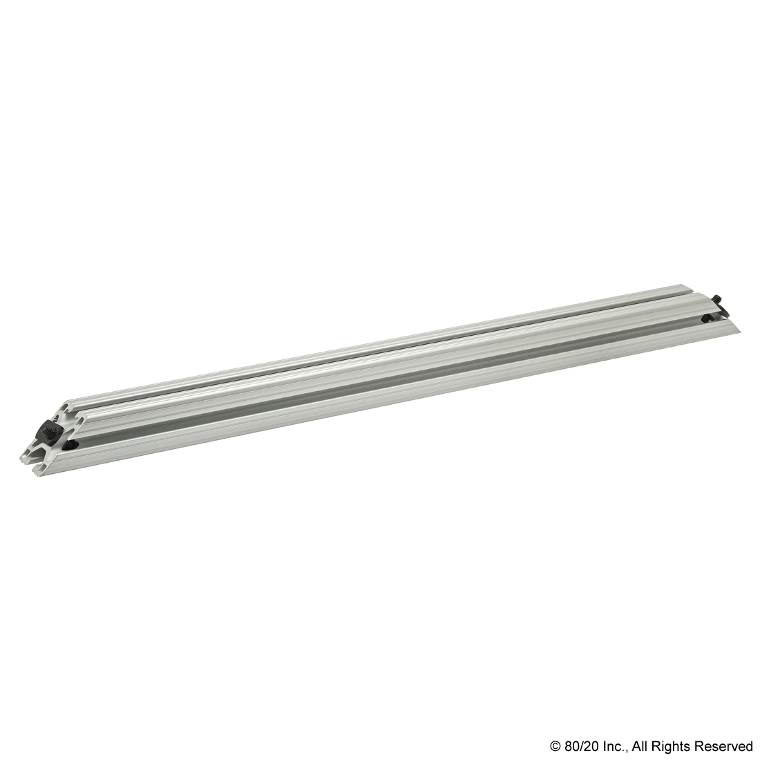 THE 45 DEGREE SUPPORT ASSEMBLY INCLUDES SOCKET HEAD CAP SCREWS, WASHERS AND T-NUTS. THE SUPPORT ASSEMBLY IS PRE-MACHINED WITH COUNTERBORES AND A 45 DEGREE MITER ANGLE ON BOTH ENDS. THIS FASTENING METHOD PROVIDES A CLEAN, FLUSH CONNECTION AND IS TYPICALLY USED TO REINFORCE A 90 DEGREE CONNECTION. THIS CONNECTION LENDS ITSELF TO APPLICATIONS WITH HEAVY LOADS TO MINIMIZE BEAM DEFLECTION.