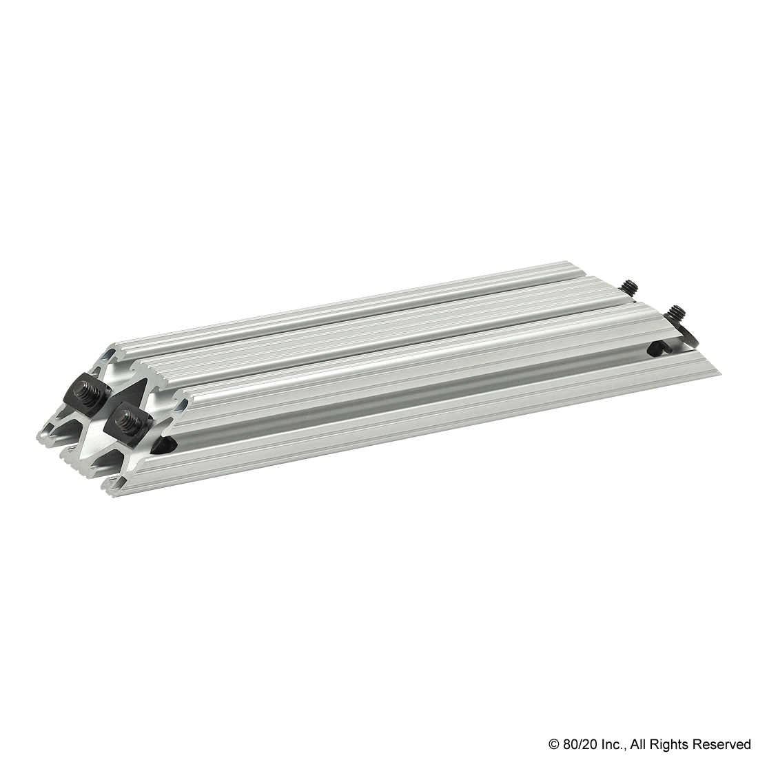 THE 45 DEGREE SUPPORT ASSEMBLY INCLUDES SOCKET HEAD CAP SCREWS, WASHERS AND T-NUTS. THE SUPPORT ASSEMBLY IS PRE-MACHINED WITH COUNTERBORES AND A 45 DEGREE MITER ANGLE ON BOTH ENDS. THIS FASTENING METHOD PROVIDES A CLEAN, FLUSH CONNECTION AND IS TYPICALLY USED TO REINFORCE A 90 DEGREE CONNECTION. THIS CONNECTION LENDS ITSELF TO APPLICATIONS WITH HEAVY LOADS TO MINIMIZE BEAM DEFLECTION.