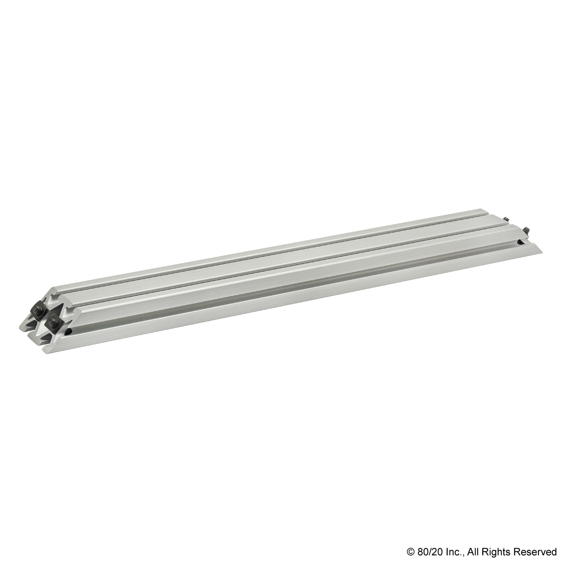 THE 45 DEGREE SUPPORT ASSEMBLY INCLUDES SOCKET HEAD CAP SCREWS, WASHERS AND T-NUTS. THE SUPPORT ASSEMBLY IS PRE-MACHINED WITH COUNTERBORES AND A 45 DEGREE MITER ANGLE ON BOTH ENDS. THIS FASTENING METHOD PROVIDES A CLEAN, FLUSH CONNECTION AND IS TYPICALLY USED TO REINFORCE A 90 DEGREE CONNECTION. THIS CONNECTION LENDS ITSELF TO APPLICATIONS WITH HEAVY LOADS TO MINIMIZE BEAM DEFLECTION.
