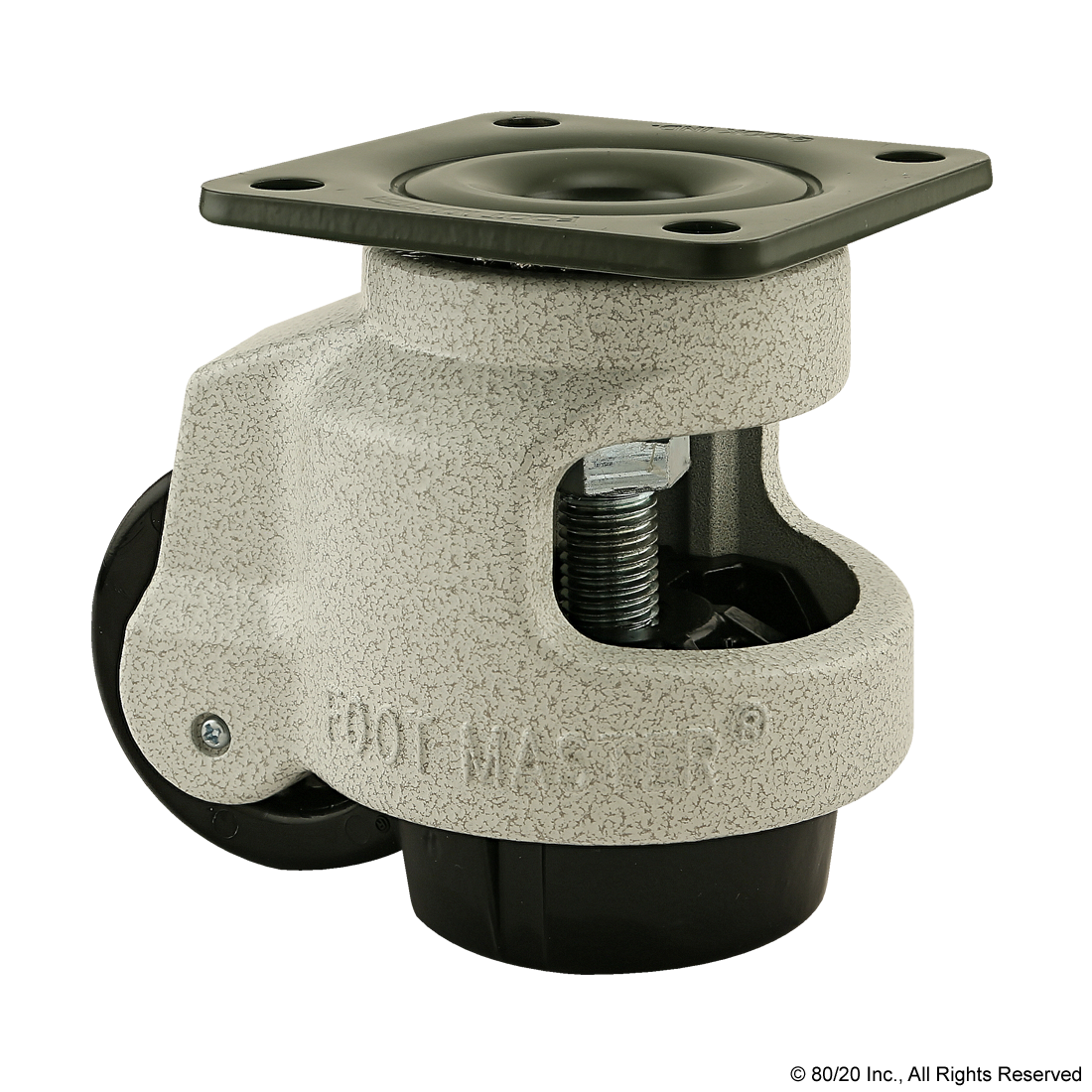 THE LEVELING CASTER IS A FOOT THAT INCORPORATES BOTH LEVELING FEATURES AND MOBILITY WITH ONE COMPONENT. IT IS COMMONLY MOUNTED TO THE END OR SIDE OF A T-SLOT PROFILE WITH A BASE PLATE. THE LEVELING CASTER IS AVAILABLE IN FOUR SIZES. IT IS IDEAL FOR LARGE MACHINE AND AUTOMATION FRAMES. NOTE: *CENTER BAR NOT AVAILABLE ON PART NUMBERS 2717 AND 40-2717.