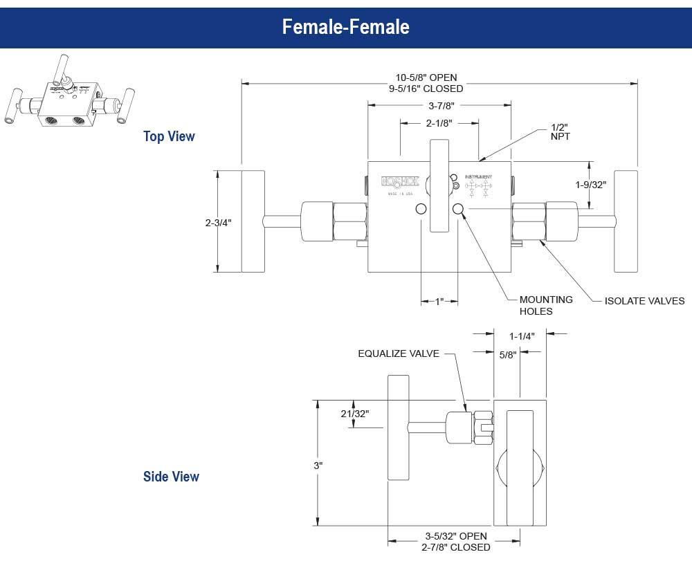 - Additional Options:Â Soft SeatsPEEK (PK1)PCTFE (KF1)O-ringsEPDM (EM1)FFKM (Perfluoroelastomer ( FFKM) 3018 or equivalent) (KZ1)NBR (NB1)Note for O-rings - Other o-ring materials available on request.Handles1" Round knurled (HL3)1-3/8" Phenolic (HL4)1-3/4" Phenolic (HL5)Body Material:Â Zinc-nickel plated steel, electropolished 316 Stainless SteelCategory:Â 3510 Series 0.375 in. Orifice Differential Pressure 3 Manifold Valves with Soft SeatConnection Size:Â 1/2Connection Type:Â National Pipe Thread (NPT) Standard or FlangeConnectors:Â NOSHOK offers Stabilized & Non-Stabilized Connectors, as well as Stabilized Connectors With Integral Block Valve designed to reinforce the entire installation by shifting radial-stress load away from the NPT connections.Differential Pressure Gauges:Â Differential pressure gauges measure and visually indicate the difference between two pressure points within a process system. NOSHOK offers Piston Type and Diaphragm Type Differential Pressure Gauges.Direct Connect Assembly For Oil & Gas Applications:Â The NOSHOK Direct Connect Assembly provides an installation that keeps the meter close to the orifice taps for accurate flow measurements.Flow Coefficient Cv:Â 3.0Installed Options and Accessories:Â PackingPTFE Manifold Gasket Ring (RG1-TF1)Graphite Manifold Gasket (RG1-GF1) Traditional to Coplanar Flange Adapter (TCA-S)Options:Â Panel mountings, o-ring materials, handles, packings, regulating stem and stem tipsOrifice Size:Â 0.375Pressure Rating at 200 Degree Fahrenheit (F) Temperature:Â 6,000Process Type:Â Differential PressureRelated Items:Â MK4-CS, 5 Valve Steel Mounting Kit|MK4-SS2, 5 Valve 304 Stainless Steel Mounting KitSchemaID:Â 106318Seat:Â Soft SeatSeries:Â 3-ValveStem Seal and Type:Â All 316 Stainless Steel stems with Fluorocarbon (FKM) o-ring and Polytetrafluoroethylene (PTFE) back-up ring below the threadsSyndication_SET:Â 1Type:Â Manifold ValveUnit_SET:Â 1Valve Material:Â Stainless SteelValve Type:Â Female-Female