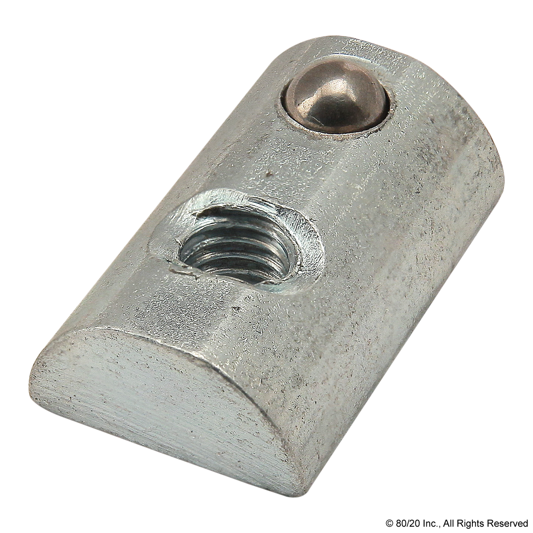 THE ROLL-IN T-NUT WITH BALL SPRING IS A FASTENING OPTION THAT LOADS FROM THE PROFILE ENDS OR SIDE, WHICH IS HELPFUL FOR APPLICATIONS WHERE THE ENDS ARE INACCESSIBLE. THE BALL SPRING HOLDS THE T-NUT IN THE T-SLOT, EVEN WHEN THE PROFILE IS IN A VERTICAL POSITION, SIMPLIFYING THE ASSEMBLY PROCESS. IT IS AVAILABLE WITH OPTIONS IN SIZE, MATERIAL, THREAD, AND FINISH.