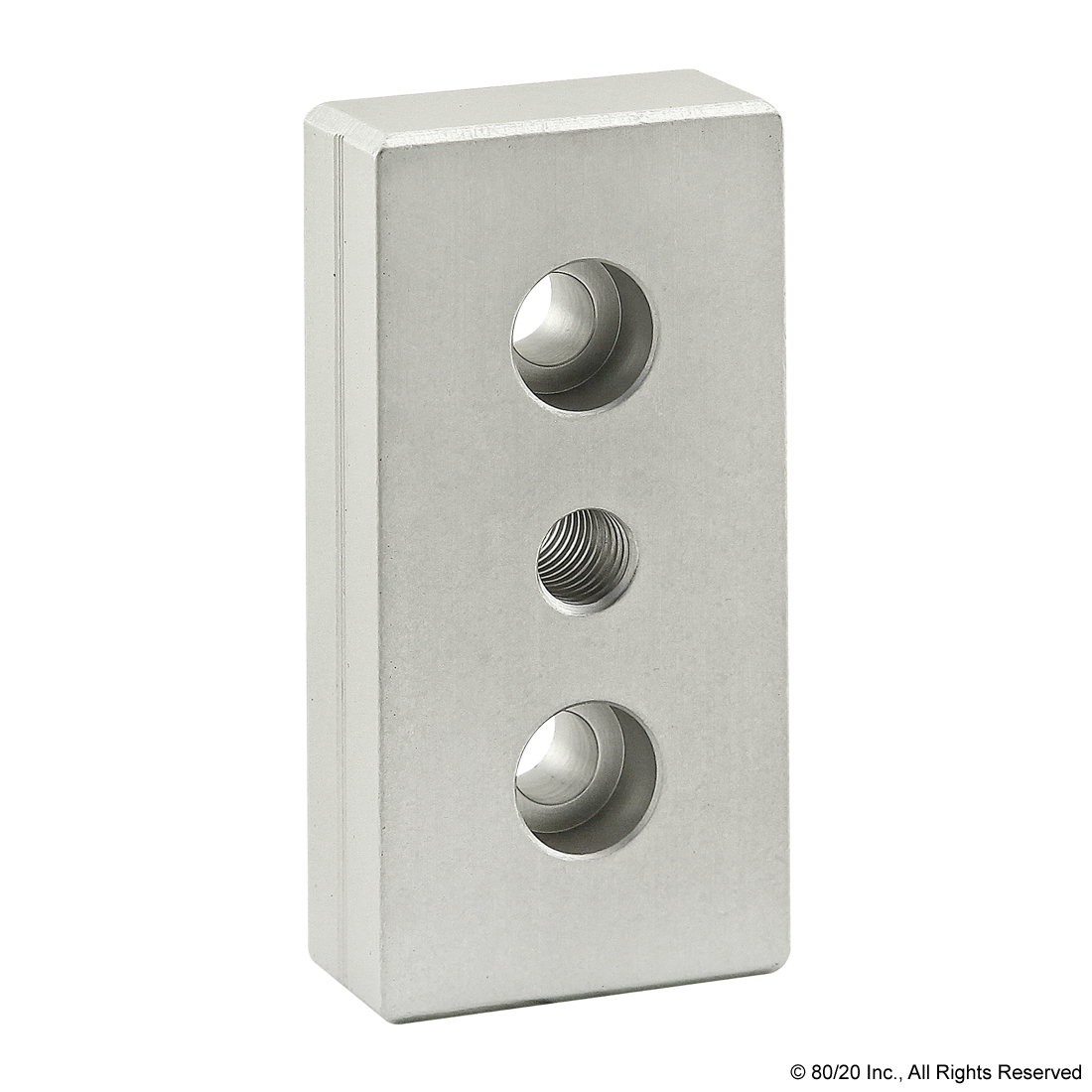 THE 3 HOLE - CENTER TAP BASE PLATE IS MADE OF ANODIZED ALUMINUM TO WITHSTAND DAILY USE AND WEAR AND TEAR. IT MOUNTS LEVELING FEET AND THREADED STEM CASTERS, AND IS COMMONLY USED ON A RECTANGULAR PROFILE END TO CENTER MOUNT THE FOOT OR CASTER. THE 3 HOLE - CENTER TAP BASE PLATE CAN ALSO BE USED ON A PROFILE SIDE. IT REQUIRES A TAP TO MOUNT TO A PROFILE END.,