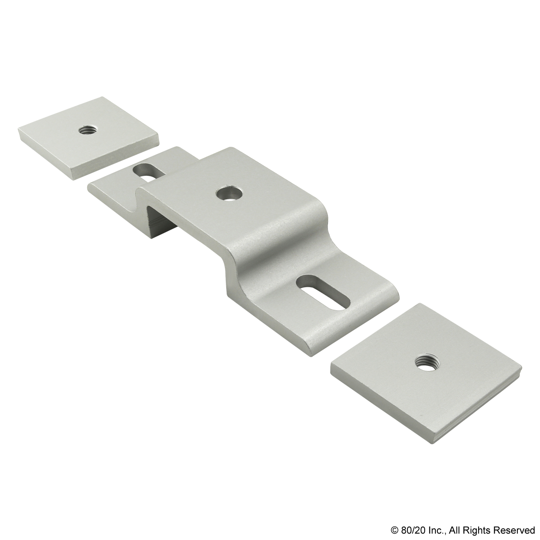 THE DOUBLE ARM NARROW MESH RETAINER WITH NARROW BACKING PLATES CONSISTS OF ONE DOUBLE ARM NARROW MESH RETAINER AND TWO NARROW BACKING PLATES. THE HARDWARE TO ATTACH THE BACKING PLATES TO THE RETAINER SHOULD BE SELECTED BASED ON THE WIRE MESH PANEL TYPE AND THICKNESS. THE SUGGESTED HARDWARE TO MOUNT THE RETAINER TO THE T-SLOT CAN BE FOUND ON THE "SUGGESTED HARDWARE" TAB.