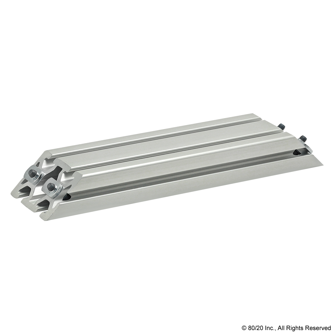 THE 45 DEGREE SUPPORT ASSEMBLY INCLUDES SOCKET HEAD CAP SCREWS, WASHERS AND T-NUTS. THE SUPPORT ASSEMBLY IS PRE-MACHINED WITH COUNTERBORES AND A 45 DEGREE MITER ANGLE ON BOTH ENDS. THIS FASTENING METHOD PROVIDES A CLEAN, FLUSH CONNECTION AND IS TYPICALLY USED TO REINFORCE A 90 DEGREE CONNECTION. THIS CONNECTION LENDS ITSELF TO APPLICATIONS WITH HEAVY LOADS TO MINIMIZE BEAM DEFLECTION.