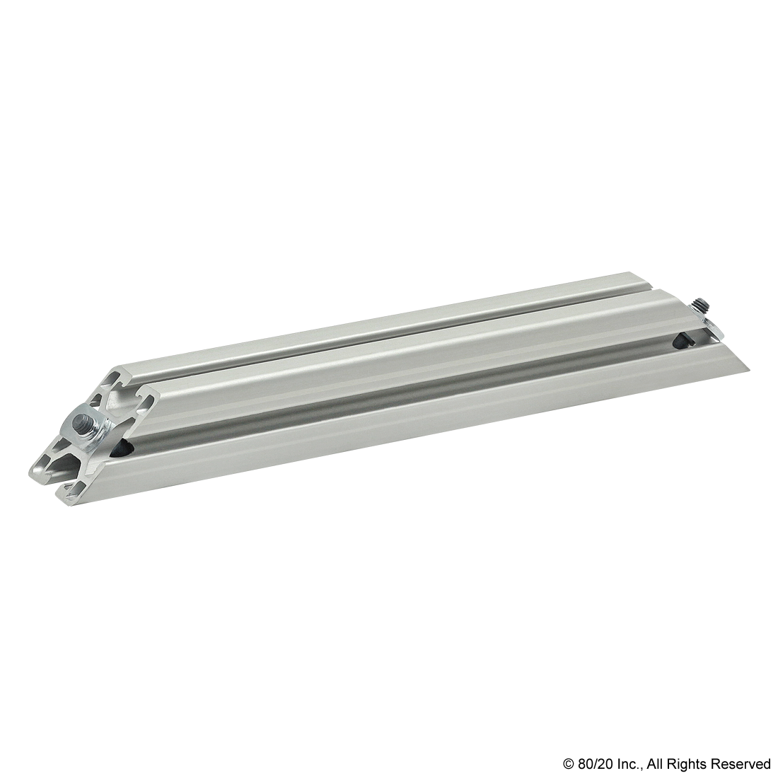 THE 45 DEGREE SUPPORT ASSEMBLY INCLUDES SOCKET HEAD CAP SCREWS, WASHERS AND T-NUTS. THE SUPPORT ASSEMBLY IS PRE-MACHINED WITH COUNTERBORES AND A 45 DEGREE MITER ANGLE ON BOTH ENDS. THIS FASTENING METHOD PROVIDES A CLEAN, FLUSH CONNECTION AND IS TYPICALLY USED TO REINFORCE A 90 DEGREE CONNECTION. THIS CONNECTION LENDS ITSELF TO APPLICATIONS WITH HEAVY LOADS TO MINIMIZE BEAM DEFLECTION.