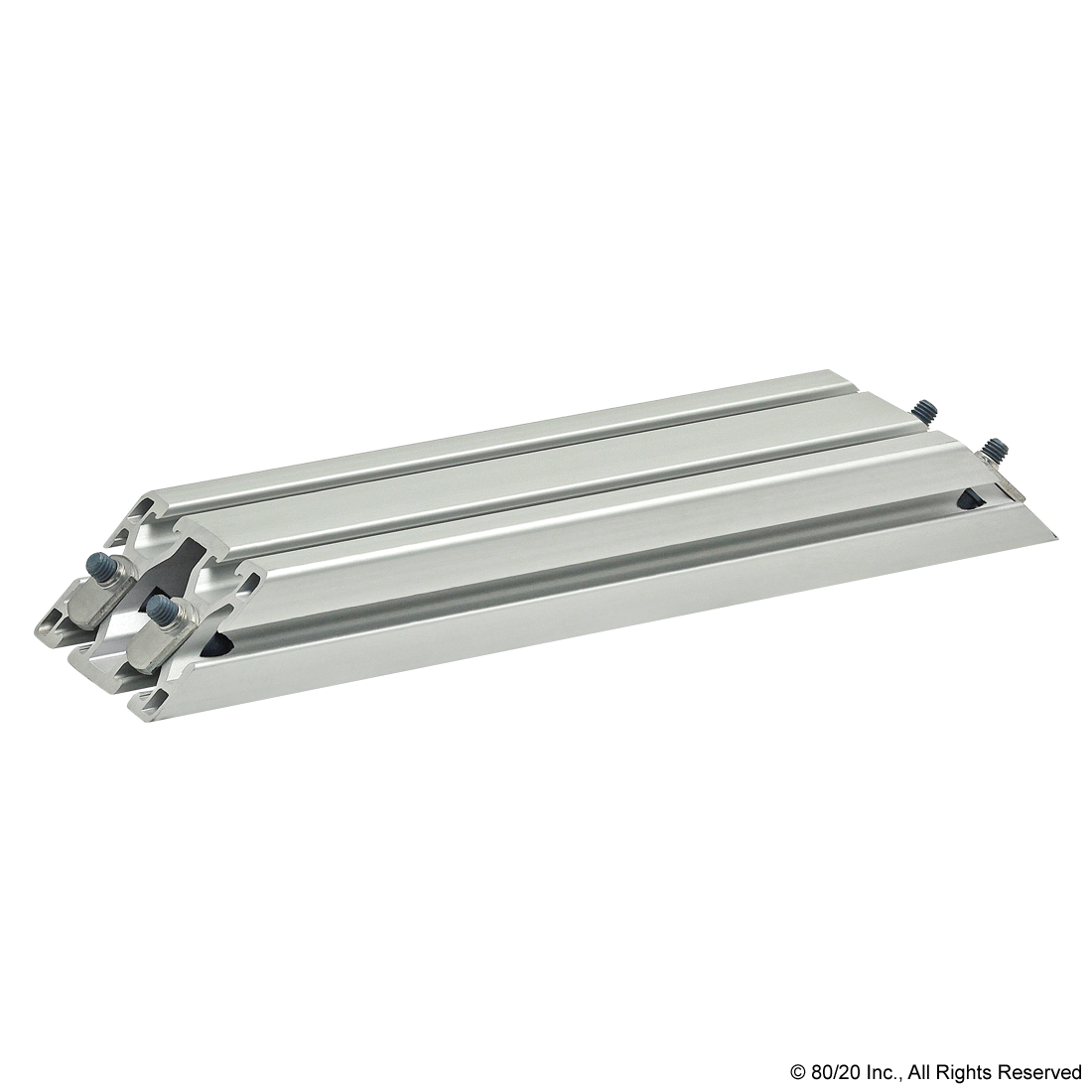 THE 45 DEGREE SUPPORT ASSEMBLY INCLUDES SOCKET HEAD CAP SCREWS, WASHERS AND T-NUTS. THE SUPPORT ASSEMBLY IS PRE-MACHINED WITH COUNTERBORES AND A 45 DEGREE MITER ANGLE ON BOTH ENDS. THIS FASTENING METHOD PROVIDES A CLEAN, FLUSH CONNECTION AND IS TYPICALLY USED TO REINFORCE A 90 DEGREE CONNECTION. THIS CONNECTION LENDS ITSELF TO APPLICATIONS WITH HEAVY LOADS TO MINIMIZE BEAM DEFLECTION.