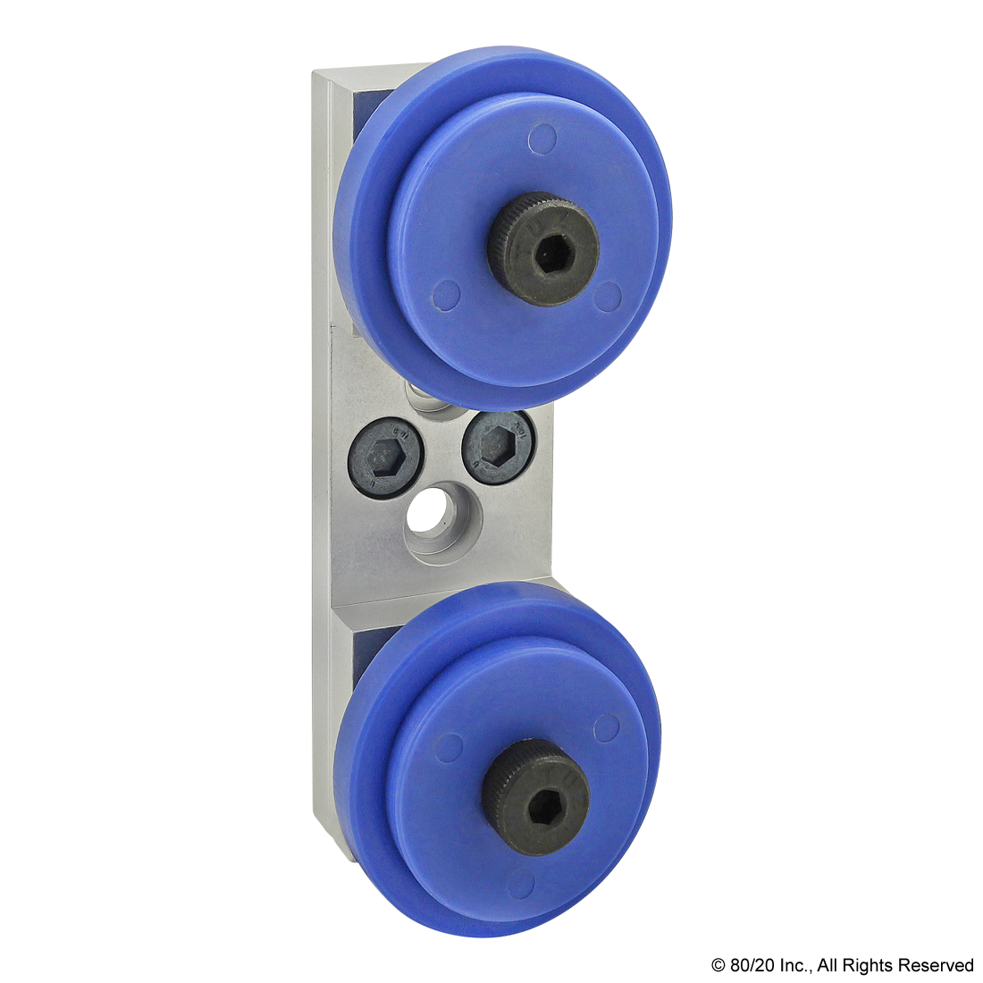 THE DUAL ROLLER WHEEL BRACKET ASSEMBLY MOUNTS TO A T-SLOT PROFILE AND INCLUDES ONE DUAL ROLLER WHEEL BRACKET AND TWO ROLLER WHEELS WITH PERMANENT LUBRICATED BUSHINGS OR BALL BEARINGS. THE ASSEMBLY IS COMMONLY USED TO CREATE DOOR FRAMES, LINEAR GLIDES, OR TRACK SYSTEMS. THE MOUNTING HARDWARE IS INCLUDED.