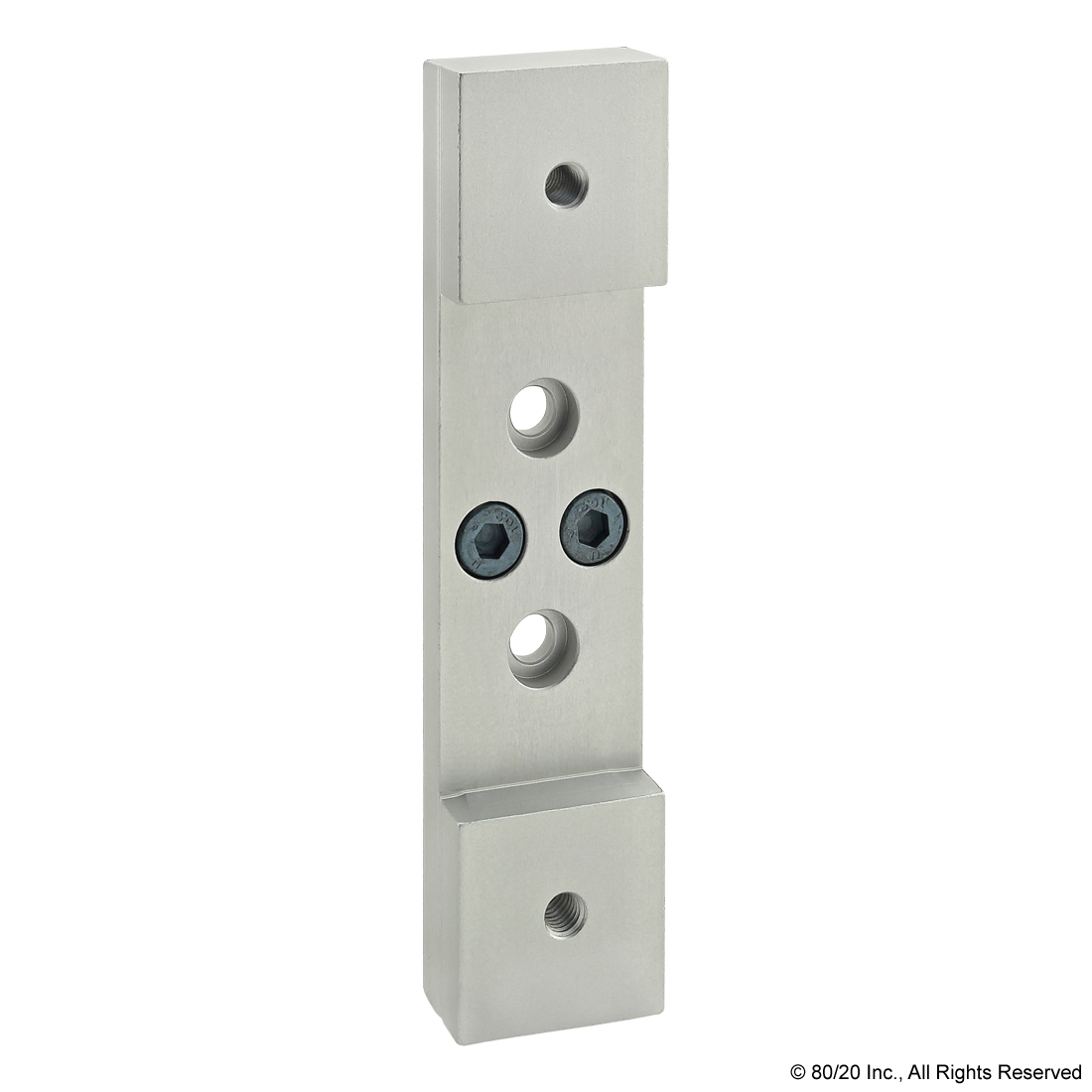 THE DUAL ROLLER WHEEL BRACKET IS MADE OF ANODIZED ALUMINUM AND MOUNTS TO A T-SLOT PROFILE. IT IS COMMONLY USED WITH ROLLER WHEELS TO FORM ASSEMBLIES THAT CREATE DOOR FRAMES, LINEAR GLIDES, AND TRACK SYSTEMS. THE MOUNTING HARDWARE IS INCLUDED.