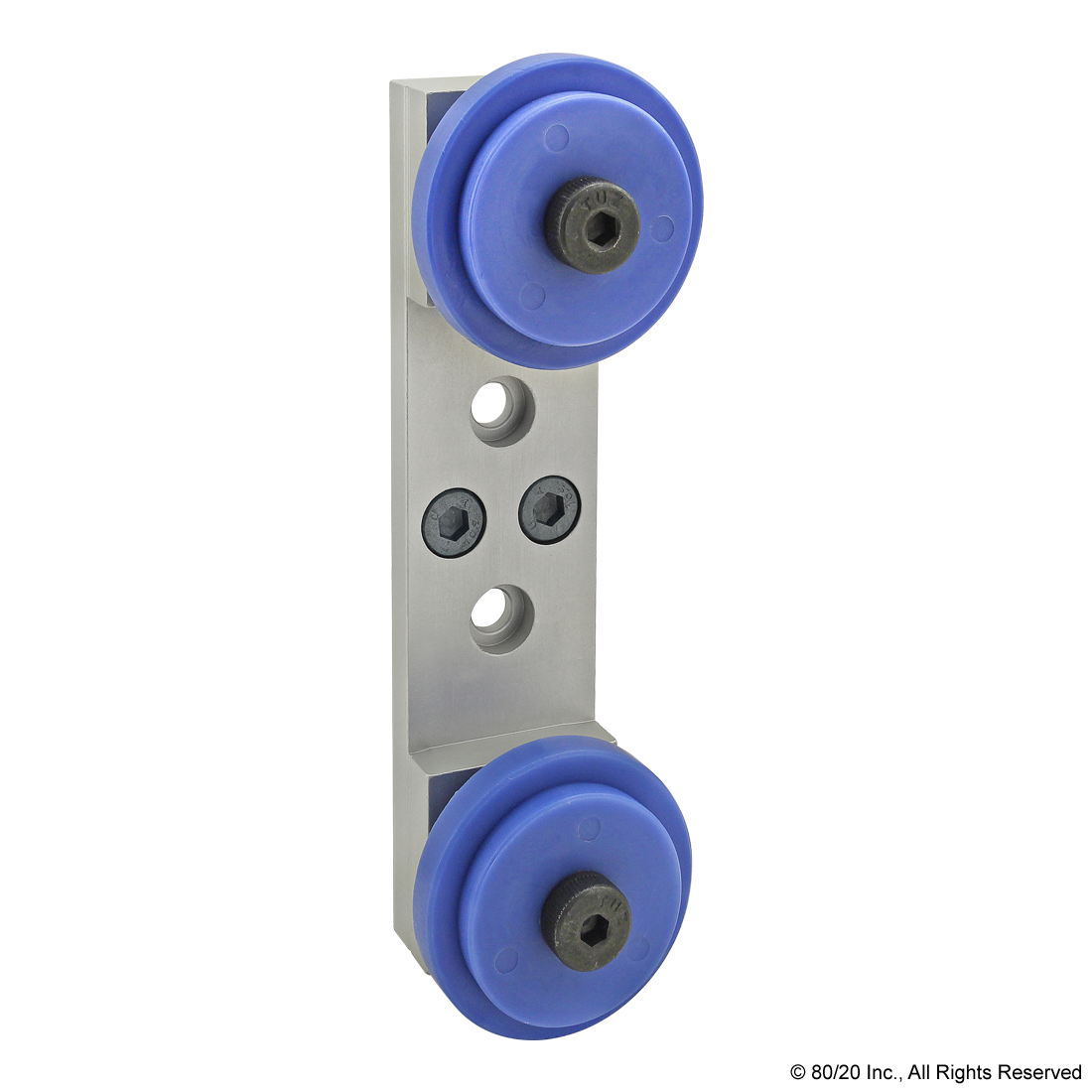 THE DUAL ROLLER WHEEL BRACKET ASSEMBLY MOUNTS TO A T-SLOT PROFILE AND INCLUDES ONE DUAL ROLLER WHEEL BRACKET AND TWO ROLLER WHEELS WITH PERMANENT LUBRICATED BUSHINGS OR BALL BEARINGS. THE ASSEMBLY IS COMMONLY USED TO CREATE DOOR FRAMES, LINEAR GLIDES, OR TRACK SYSTEMS. THE MOUNTING HARDWARE IS INCLUDED.