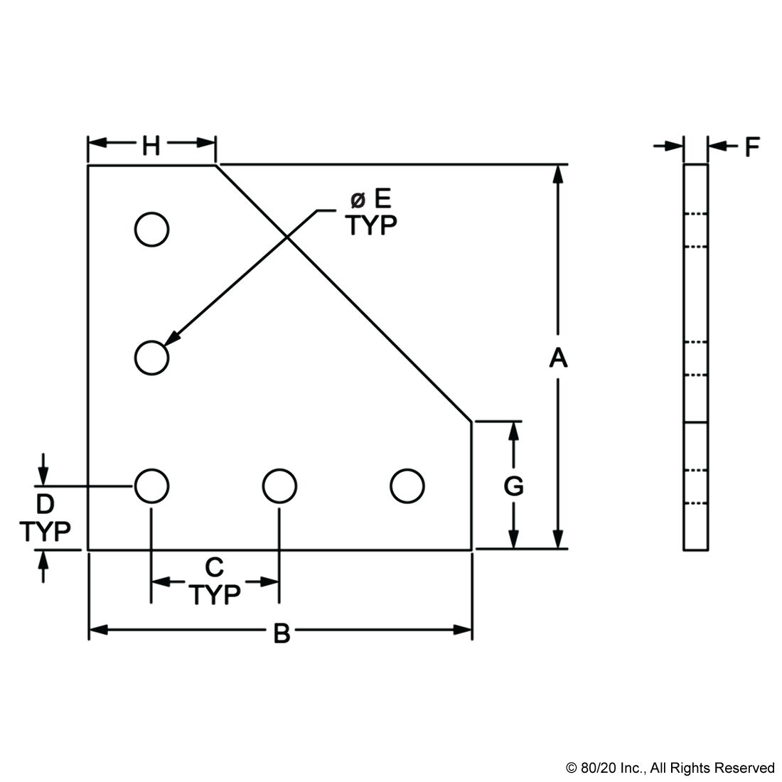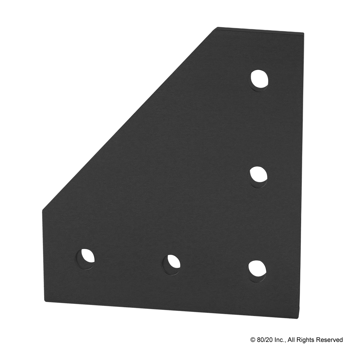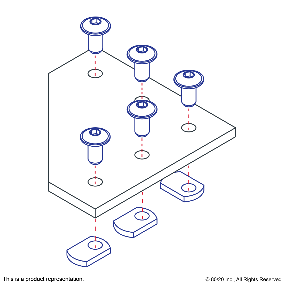 THE 5 HOLE - 90 DEGREE ANGLED FLAT PLATE IS AN EXTERNAL FASTENING METHOD THAT REQUIRES NO MACHINING SERVICES. THIS FLAT PLATE CREATES A 90-DEGREE ANGLE BETWEEN PROFILES AND ITS SHAPE REINFORCES THE STRENGTH OF THE CONNECTION. IT IS A DURABLE OPTION THAT IS EASY TO ASSEMBLE AND CAN BE RECONFIGURED AND REUSED. THE SUGGESTED MOUNTING HARDWARE CAN BE FOUND ON THE "SUGGESTED HARDWARE" TAB. TIP: USE DOUBLE OR TRIPLE SLIDE-IN ECONOMY T-NUTS TO SAVE TIME AND MONEY. PRE-LOAD YOUR HARDWARE PRIOR TO CONNECTING PROFILES TO SIMPLIFY YOUR ASSEMBLY.
