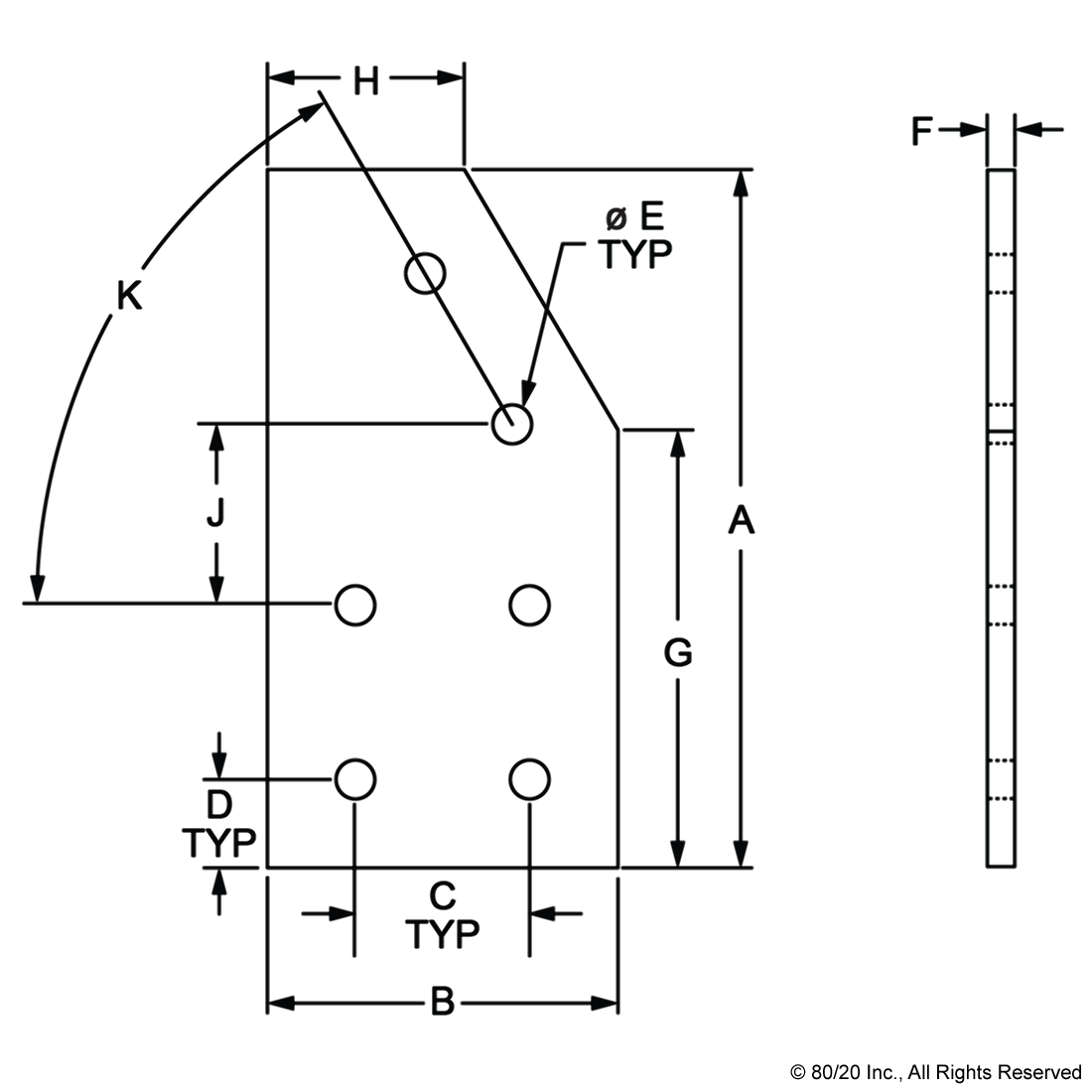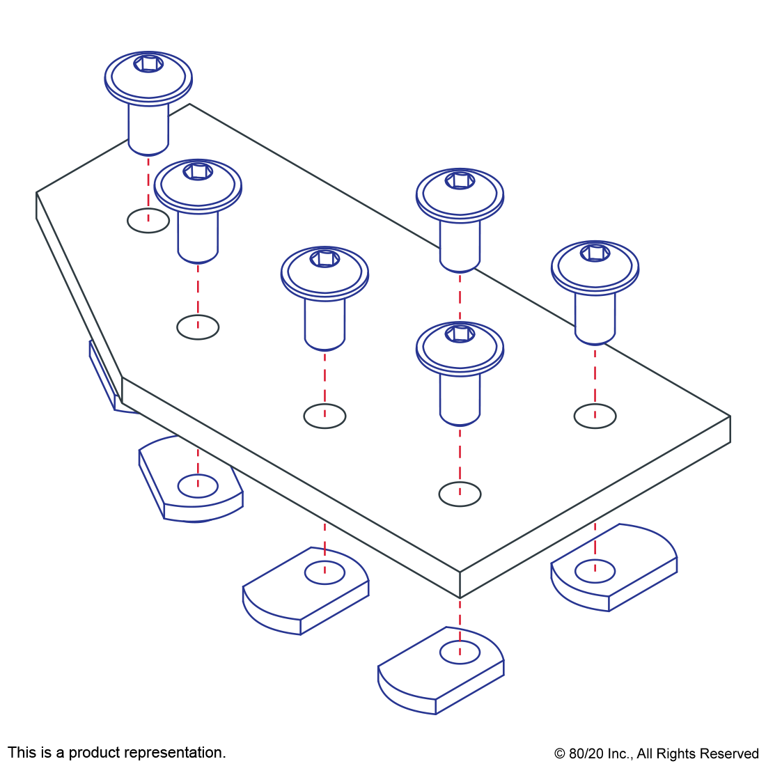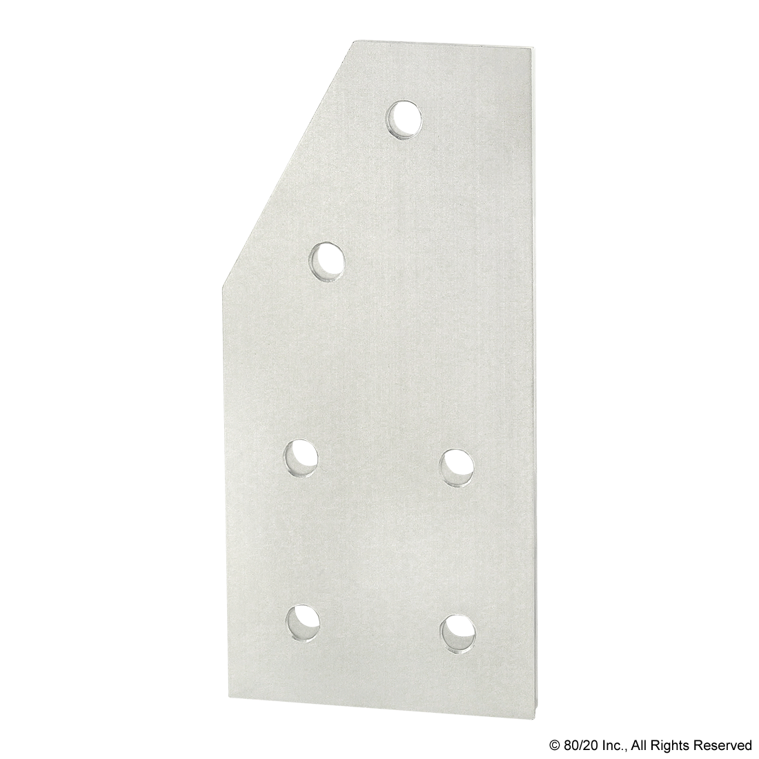 THE 6 HOLE - 60 DEGREE ANGLED FLAT PLATE IS AN EXTERNAL FASTENING METHOD THAT REQUIRES NO MACHINING SERVICES. THIS FLAT PLATE CREATES A 60 DEGREE ANGLE BETWEEN PROFILES AND ITS SHAPE REINFORCES THE STRENGTH OF THE CONNECTION. IT IS A DURABLE OPTION THAT IS EASY TO ASSEMBLE AND CAN BE RECONFIGURED AND REUSED. THE SUGGESTED MOUNTING HARDWARE CAN BE FOUND ON THE "SUGGESTED HARDWARE" TAB. TIP: USE A DOUBLE SLIDE-IN ECONOMY T-NUT TO SAVE TIME AND MONEY. PRE-LOAD YOUR HARDWARE PRIOR TO CONNECTING PROFILES TO SIMPLIFY YOUR ASSEMBLY.