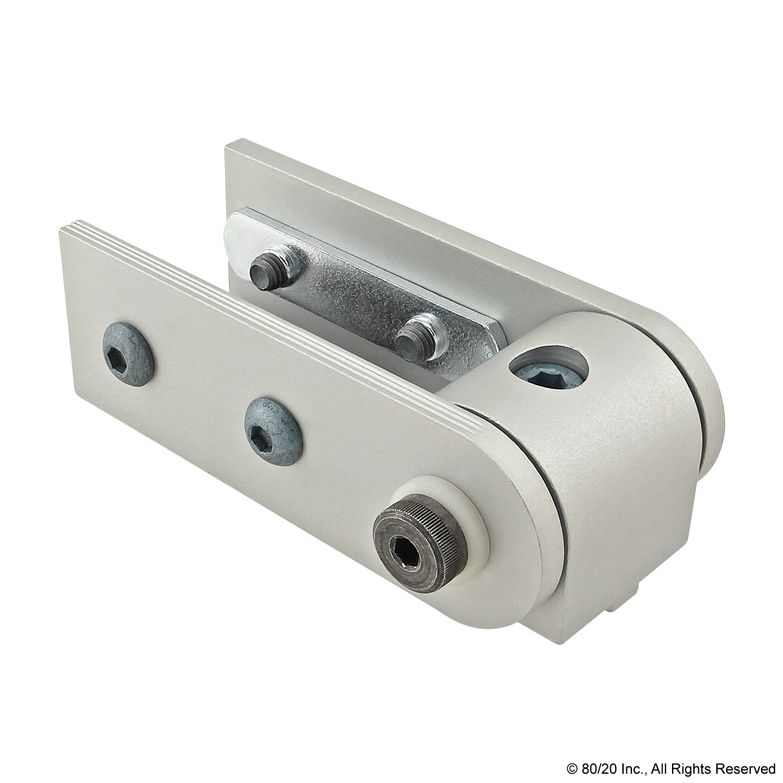 THE STANDARD 0 DEGREE DYNAMIC PIVOT ASSEMBLY WITH DUAL STRAIGHT ARMS IS TYPICALLY USED TO CREATE DYNAMIC PIVOTS THAT ARE PARALLEL TO THE MOUNTING PROFILE AND HAVE FULL AXIAL MOTION RANGING FROM 0-180 DEGREES. THE ASSEMBLY INCLUDES ONE 0 DEGREE DYNAMIC PIVOT NUB AND TWO STANDARD STRAIGHT DYNAMIC PIVOT ARMS. IT HAS PERMANENTLY LUBRICATED BRONZE BUSHINGS THAT ACT AS HIGH-STRENGTH PIVOT POINTS AND NYLON THRUST WASHERS THAT PROTECT THE PIVOT ARMS. THIS ASSEMBLY OFFERS A HIGH LOAD CAPACITY WHILE ENSURING A LONG LIFE CYCLE. A SHIM KIT AND THE HARDWARE TO CONNECT THE NUB TO THE PROFILE, THE NUB TO THE ARMS, AND THE ARMS TO THE PROFILE ARE ALL INCLUDED.