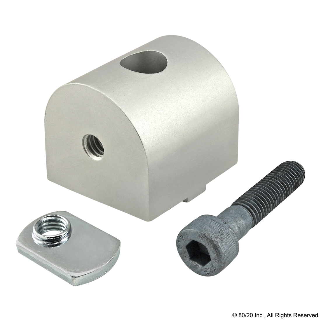 THE 0 DEGREE STRUCTURAL PIVOT NUB IS AN EXTERNAL FASTENING METHOD COMMONLY USED AS A CONNECTION HUB TO CREATE A STRUCTURAL PIVOT RANGING FROM 0-180 DEGREES PARALLEL TO THE MOUNTING PROFILE. IT HAS A SLOT TAB THAT HELPS PREVENT THE NUB FROM ROTATING AS WELL AS ASSISTS WITH ALIGNMENT IN THE T-SLOT. THE 0 DEGREE STRUCTURAL PIVOT NUB REQUIRES NO MACHINING SERVICES AND CAN BE EASILY ASSEMBLED, LENDING ITSELF TO REPOSITIONING AND REUSE. THE SUGGESTED MOUNTING HARDWARE CAN BE FOUND ON THE "SUGGESTED HARDWARE" TAB. ,
