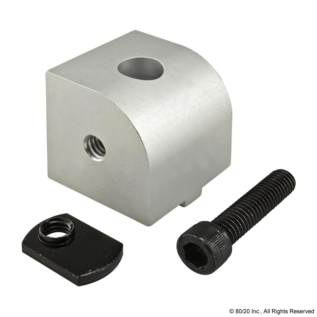 THE 0 DEGREE DYNAMIC RIGHT ANGLE PIVOT NUB IS COMMONLY USED AS A CONNECTION HUB FOR DYNAMIC PIVOTS TO CREATE AXIAL MOTION RANGING FROM 0-90 DEGREES PARALLEL TO THE MOUNTING PROFILE. THIS PIVOT NUB REQUIRES NO MACHINING SERVICES AND CAN BE EASILY ASSEMBLED, LENDING ITSELF TO REPOSITIONING AND REUSE. THE HARDWARE TO MOUNT THE NUB TO A PROFILE IS INCLUDED. THE SUGGESTED MOUNTING HARDWARE TO ATTACH THE ARM TO THE NUB CAN BE FOUND ON THE "SUGGESTED HARDWARE" TAB.,