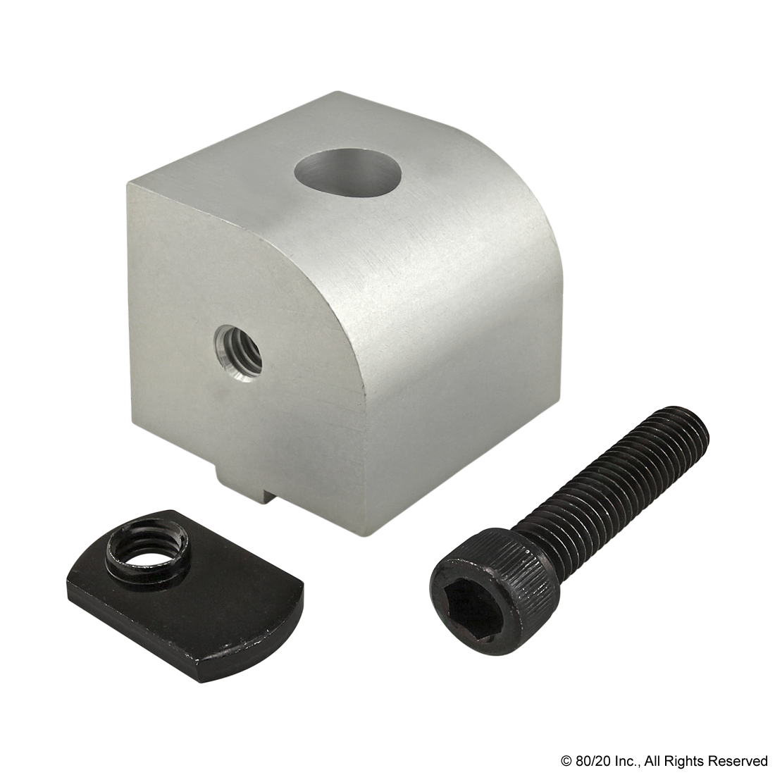THE 90 DEGREE DYNAMIC RIGHT ANGLE PIVOT NUB IS COMMONLY USED AS A CONNECTION HUB FOR DYNAMIC PIVOTS TO CREATE FULL AXIAL MOTION RANGING FROM 0-90 DEGREES PERPENDICULAR TO THE MOUNTING PROFILE. THIS PIVOT NUB REQUIRES NO MACHINING SERVICES AND CAN BE EASILY ASSEMBLED, LENDING ITSELF TO REPOSITIONING AND REUSE. THE HARDWARE TO MOUNT THE NUB TO A PROFILE IS INCLUDED. THE SUGGESTED MOUNTING HARDWARE TO ATTACH THE ARM TO THE NUB CAN BE FOUND ON THE "SUGGESTED HARDWARE" TAB.,