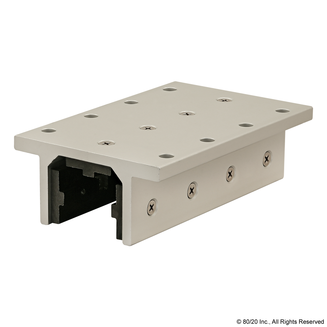 THE 3-SLOT MOUNT - DOUBLE FLANGE LONG STANDARD LINEAR BEARING WITHOUT BRAKE HOLES IS TYPICALLY USED IN LINEAR MOTION APPLICATIONS. IT HOUSES PROFILES WITH A MINIMUM OF THREE OPEN T-SLOTS, HAS A DOUBLE FLANGE AND IS A LONGER OPTION. THE BEARING INCLUDES PADS, SCREWS AND SHIMS; THE PADS ARE MADE OF SELF-LUBRICATING UHMW. ALL 80/20 BEARINGS ARE DESIGNED FOR COMPRESSION LOADS ONLY AND NOT INTENDED TO SUPPORT HANGING LOADS.