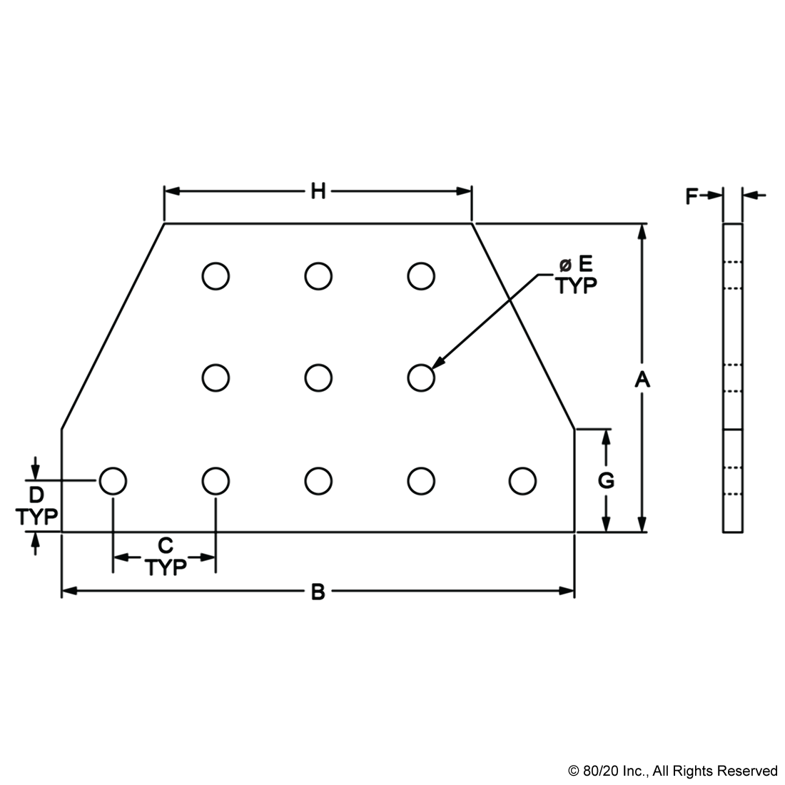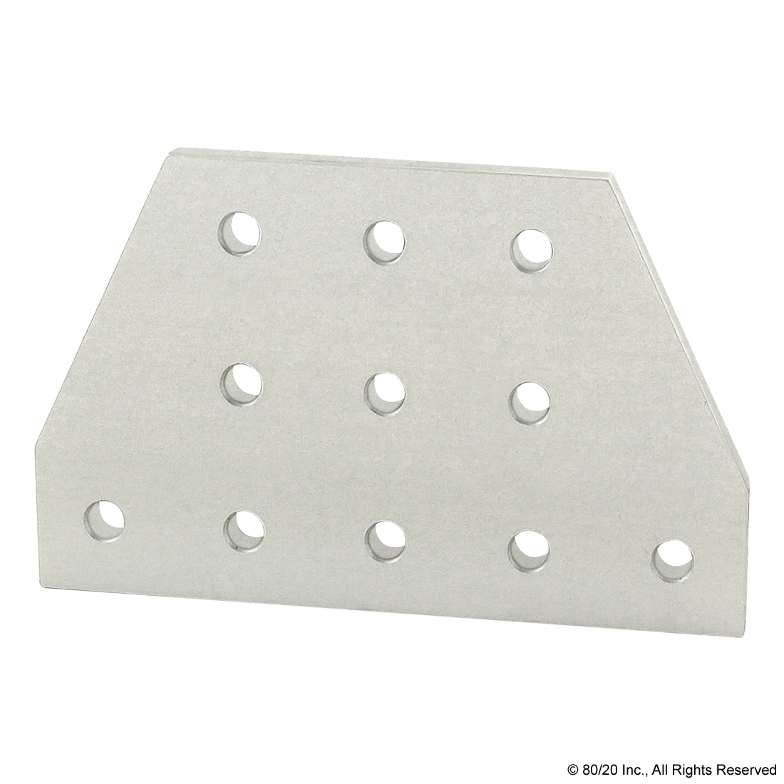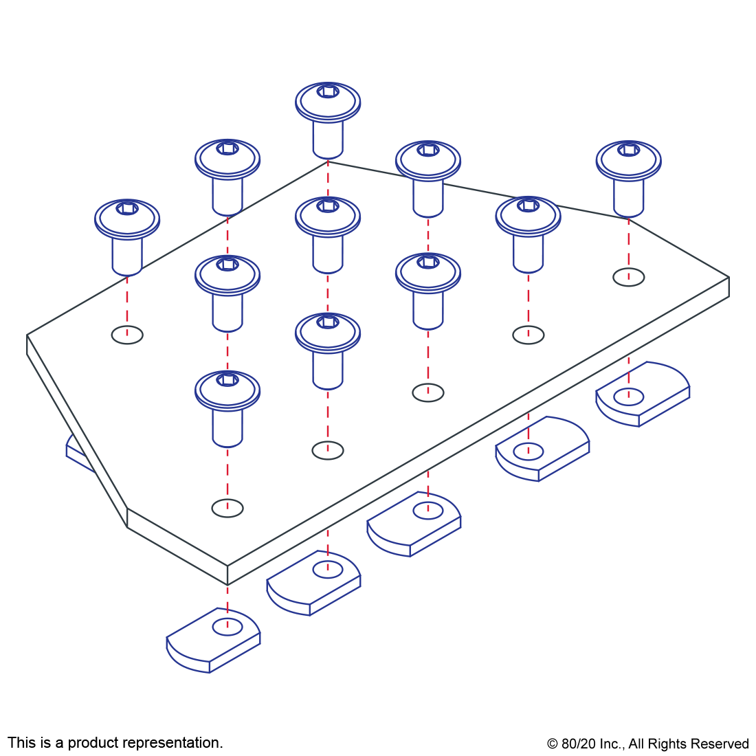 THE 11 HOLE - TEE FLAT PLATE IS A STRONG, EXTERNAL FASTENING METHOD THAT REQUIRES NO MACHINING SERVICES AND CAN BE USED TO CONNECT MORE THAN TWO PROFILES TOGETHER. THIS FASTENING OPTION CAN PROVIDE INFINITE POSITIONING ALONG THE PROFILE T-SLOT, ALLOWING FOR A LARGE DEGREE OF ADJUSTABILITY. IT IS A LONG-LASTING CONNECTION THAT IS EASILY ASSEMBLED AND CAN BE REPOSITIONED AND REUSED. THE SUGGESTED MOUNTING HARDWARE CAN BE FOUND ON THE "SUGGESTED HARDWARE" TAB. TIP: USE DOUBLE OR TRIPLE SLIDE-IN ECONOMY T-NUTS TO SAVE TIME AND MONEY. PRE-LOAD YOUR HARDWARE PRIOR TO CONNECTING PROFILES TO SIMPLIFY YOUR ASSEMBLY.