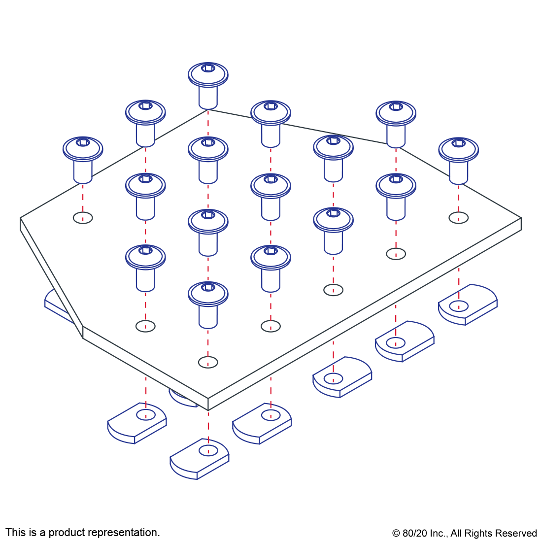THE 16 HOLE - TEE FLAT PLATE IS A STRONG, EXTERNAL FASTENING METHOD THAT REQUIRES NO MACHINING SERVICES AND CAN BE USED TO CONNECT MORE THAN TWO PROFILES TOGETHER. THIS FASTENING OPTION CAN PROVIDE INFINITE POSITIONING ALONG THE PROFILE T-SLOT, ALLOWING FOR A LARGE DEGREE OF ADJUSTABILITY. IT IS A LONG-LASTING CONNECTION THAT IS EASILY ASSEMBLED AND CAN BE REPOSITIONED AND REUSED. THE SUGGESTED MOUNTING HARDWARE CAN BE FOUND ON THE "SUGGESTED HARDWARE" TAB. TIP: USE DOUBLE OR TRIPLE SLIDE-IN ECONOMY T-NUTS TO SAVE TIME AND MONEY. PRE-LOAD YOUR HARDWARE PRIOR TO CONNECTING PROFILES TO SIMPLIFY YOUR ASSEMBLY.