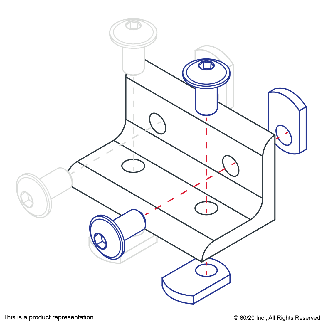 THE 4 HOLE - WIDE INSIDE CORNER BRACKET IS AN EXTERNAL FASTENING METHOD THAT CREATES A 90 DEGREE CONNECTION. THERE ARE TWO ADJACENT HOLES ON EACH SIDE OF THE BRACKET. THIS FASTENER REQUIRES NO MACHINING SERVICES AND CAN PROVIDE INFINITE POSITIONING ALONG THE PROFILE T-SLOT, ALLOWING A LARGE DEGREE OF ADJUSTABILITY. THE 4 HOLE - WIDE INSIDE CORNER BRACKET ENGAGES THE 2-DEGREE DROP-LOCK FEATURE WHEN THE ASSEMBLY BOLTS ARE TIGHTENED TO THE REQUIRED TORQUE. IT IS A FASTENING METHOD THAT CAN BE REPOSITIONED AND REUSED. THE SUGGESTED MOUNTING HARDWARE CAN BE FOUND ON THE "SUGGESTED HARDWARE" TAB. ,