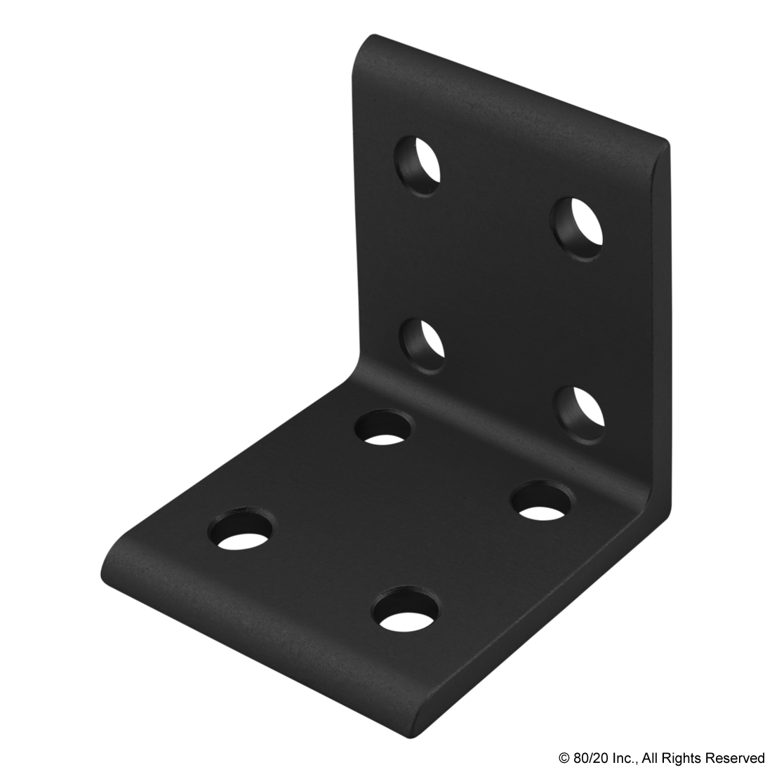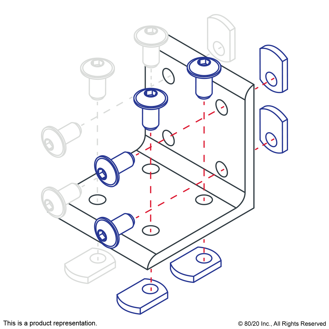 THE 8 HOLE - INSIDE CORNER BRACKET IS AN EXTERNAL FASTENING METHOD THAT CREATES A 90 DEGREE CONNECTION AND HAS FOUR HOLES ON EACH SIDE OF THE BRACKET, COMPRISED OF TWO ROWS AND TWO COLUMNS. IT REQUIRES NO MACHINING SERVICES AND CAN PROVIDE INFINITE POSITIONING ALONG THE PROFILE T-SLOT, ALLOWING A LARGE DEGREE OF ADJUSTABILITY. THE 8 HOLE - INSIDE CORNER BRACKET ENGAGES THE 2-DEGREE DROP-LOCK FEATURE WHEN THE ASSEMBLY BOLTS ARE TIGHTENED TO THE REQUIRED TORQUE. IT IS A FASTENING METHOD THAT CAN BE REPOSITIONED AND REUSED. THE SUGGESTED MOUNTING HARDWARE CAN BE FOUND ON THE "SUGGESTED HARDWARE" TAB.