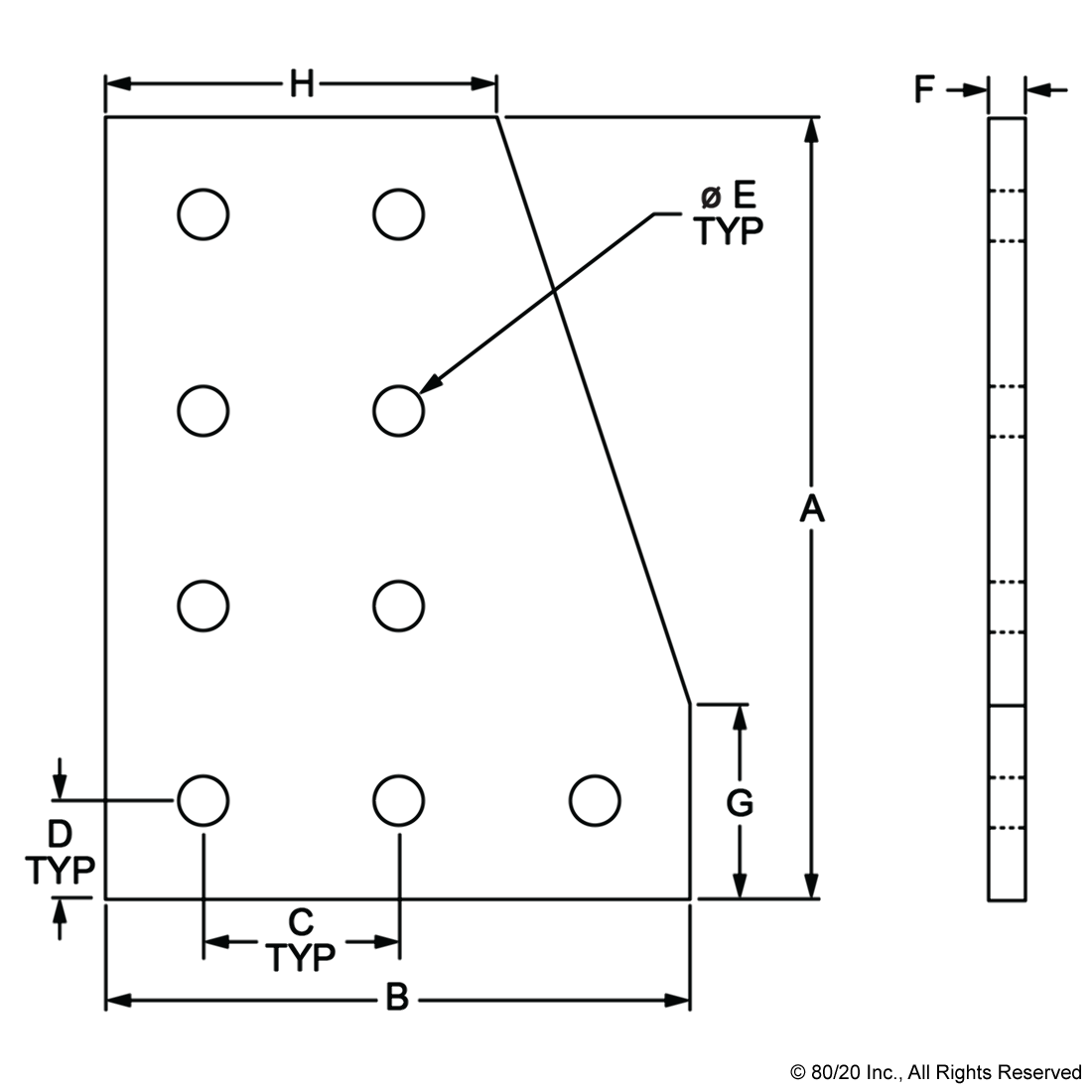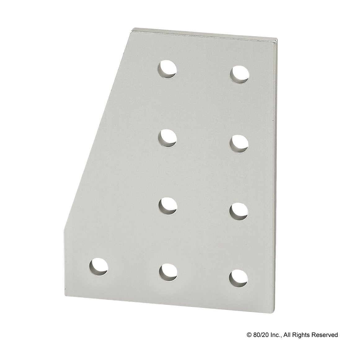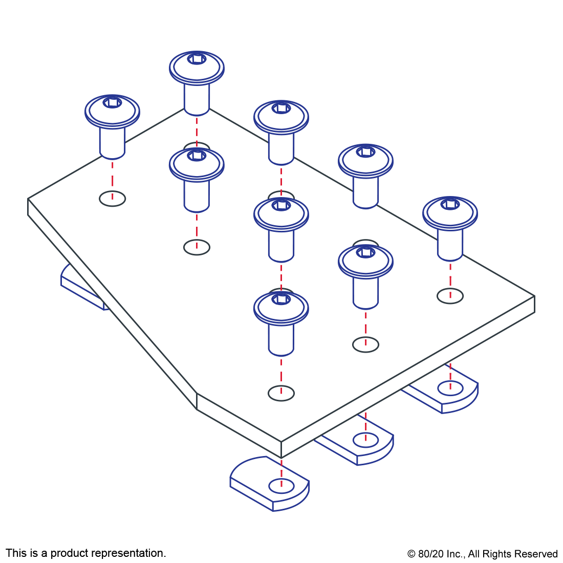 THE 9 HOLE - 90 DEGREE ANGLED FLAT PLATE IS AN EXTERNAL FASTENING METHOD THAT REQUIRES NO MACHINING SERVICES. THIS FLAT PLATE CREATES A 90-DEGREE ANGLE BETWEEN PROFILES AND ITS SHAPE REINFORCES THE STRENGTH OF THE CONNECTION. IT IS A DURABLE OPTION THAT IS EASY TO ASSEMBLE AND CAN BE RECONFIGURED AND REUSED. THE SUGGESTED MOUNTING HARDWARE CAN BE FOUND ON THE "SUGGESTED HARDWARE" TAB. TIP: USE DOUBLE OR TRIPLE SLIDE-IN ECONOMY T-NUTS TO SAVE TIME AND MONEY. PRE-LOAD YOUR HARDWARE PRIOR TO CONNECTING PROFILES TO SIMPLIFY YOUR ASSEMBLY.