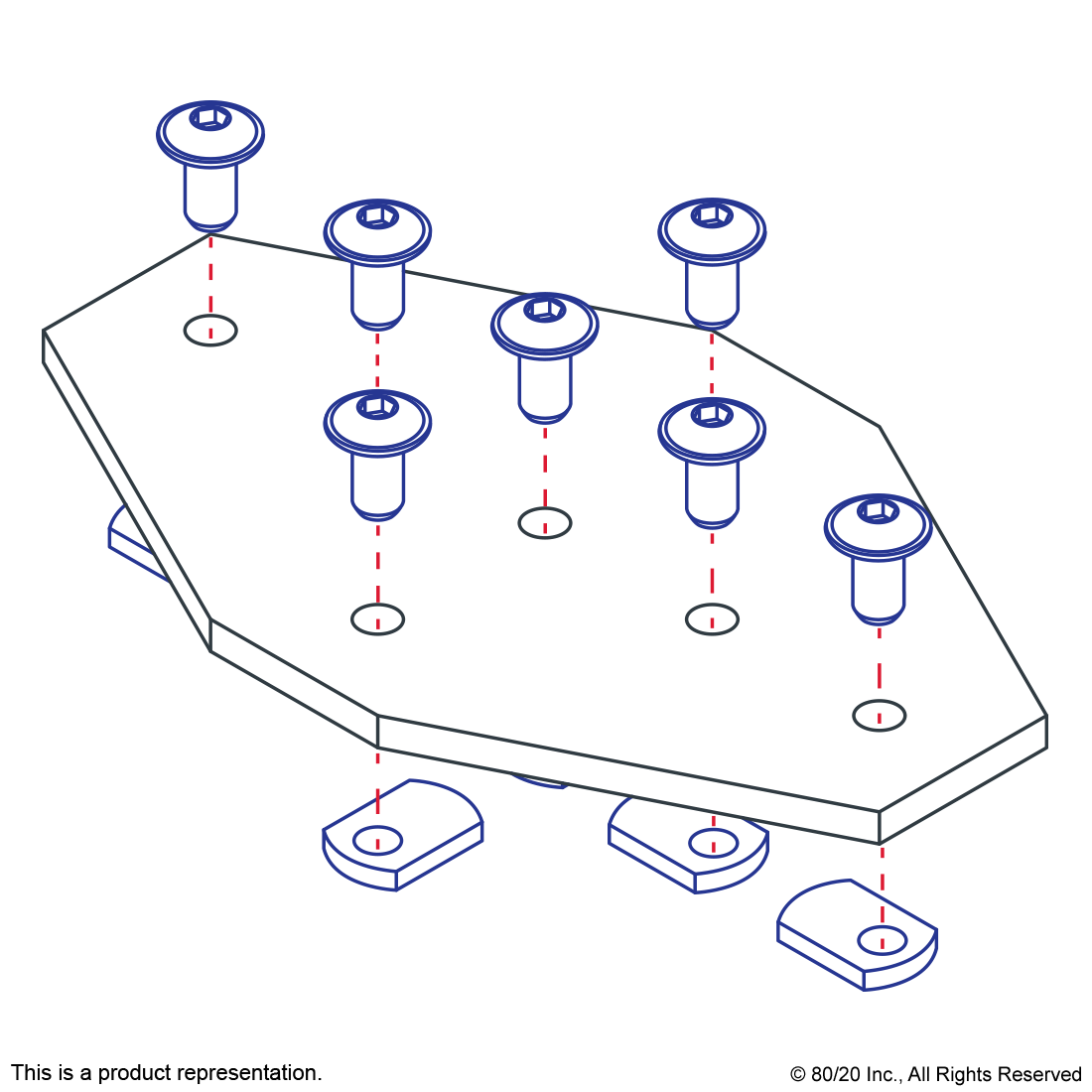 THE 7 HOLE - CROSS FLAT PLATE IS AN EXTERNAL FASTENING METHOD THAT CAN BE USED TO JOIN MORE THAN TWO PROFILES OR EVEN CREATE A 4-WAY CONNECTION HUB. IT PROVIDES A STRONG, LONG-LASTING CONNECTION THAT IS EASY TO ASSEMBLE AND REQUIRES NO MACHINING SERVICES. THE 7 HOLE - CROSS FLAT PLATE IS DURABLE AND CAN BE REPOSITIONED AND REUSED. THE SUGGESTED MOUNTING HARDWARE CAN BE FOUND ON THE "SUGGESTED HARDWARE" TAB. TIP: USE DOUBLE OR TRIPLE SLIDE-IN ECONOMY T-NUTS TO SAVE TIME AND MONEY. PRE-LOAD YOUR HARDWARE PRIOR TO CONNECTING PROFILES TO SIMPLIFY YOUR ASSEMBLY.,