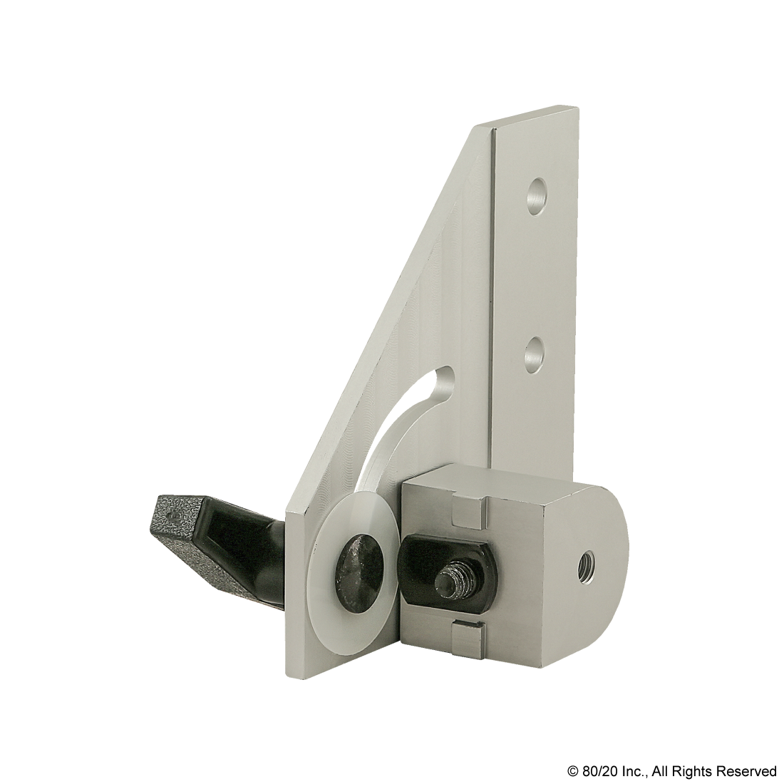 THE 90 DEGREE RIGHT HAND PIVOT BRACKET ASSEMBLY WITH €œT" HANDLE IS COMMONLY USED TO ADD MOTION TO CERTAIN ELEMENTS OF YOUR PROJECT. IT IS COMPRISED OF ONE 90 DEGREE RIGHT HAND PIVOT BRACKET, ONE €œT€ HANDLE, AND ONE 0 DEGREE STRUCTURAL PIVOT NUB. THE SHOULDER BOLT AND NYLON THRUST WASHERS ARE ALSO INCLUDED. THE BRACKET HAS A PERMANENTLY LUBRICATED BRONZE BUSHING THAT ACTS AS HIGH-STRENGTH PIVOT POINT. IT OFFERS A HIGH LOAD CAPACITY WHILE ENSURING A LONG LIFE CYCLE.