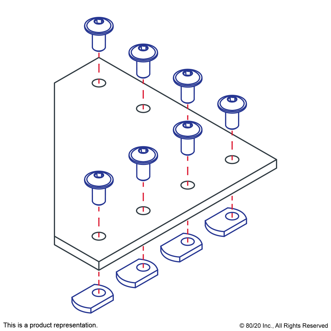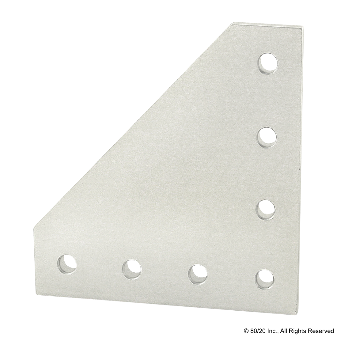 THE 7 HOLE - 90 DEGREE ANGLED SQUARED FLAT PLATE IS AN EXTERNAL FASTENING METHOD THAT REQUIRES NO MACHINING SERVICES. THIS FLAT PLATE CREATES A 90-DEGREE ANGLE BETWEEN PROFILES AND ITS SHAPE REINFORCES THE STRENGTH OF THE CONNECTION. IT IS A DURABLE OPTION THAT IS EASY TO ASSEMBLE AND CAN BE RECONFIGURED AND REUSED. THE SUGGESTED MOUNTING HARDWARE CAN BE FOUND ON THE "SUGGESTED HARDWARE" TAB. TIP: USE DOUBLE OR TRIPLE SLIDE-IN ECONOMY T-NUTS TO SAVE TIME AND MONEY. PRE-LOAD YOUR HARDWARE PRIOR TO CONNECTING PROFILES TO SIMPLIFY YOUR ASSEMBLY.