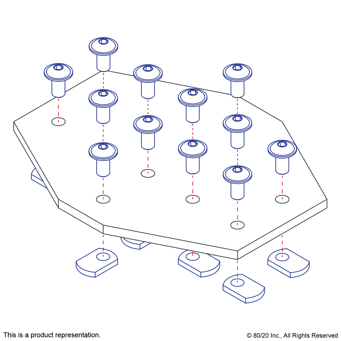 THE 12 HOLE - CROSS FLAT PLATE IS AN EXTERNAL FASTENING METHOD THAT CAN BE USED TO JOIN MORE THAN TWO PROFILES OR EVEN CREATE A 4-WAY CONNECTION HUB. IT PROVIDES A STRONG, LONG-LASTING CONNECTION THAT IS EASY TO ASSEMBLE AND REQUIRES NO MACHINING SERVICES. THE 12 HOLE - CROSS FLAT PLATE IS DURABLE AND CAN BE REPOSITIONED AND REUSED. THE SUGGESTED MOUNTING HARDWARE CAN BE FOUND ON THE "SUGGESTED HARDWARE" TAB. TIP: USE DOUBLE OR TRIPLE SLIDE-IN ECONOMY T-NUTS TO SAVE TIME AND MONEY. PRE-LOAD YOUR HARDWARE PRIOR TO CONNECTING PROFILES TO SIMPLIFY YOUR ASSEMBLY.,