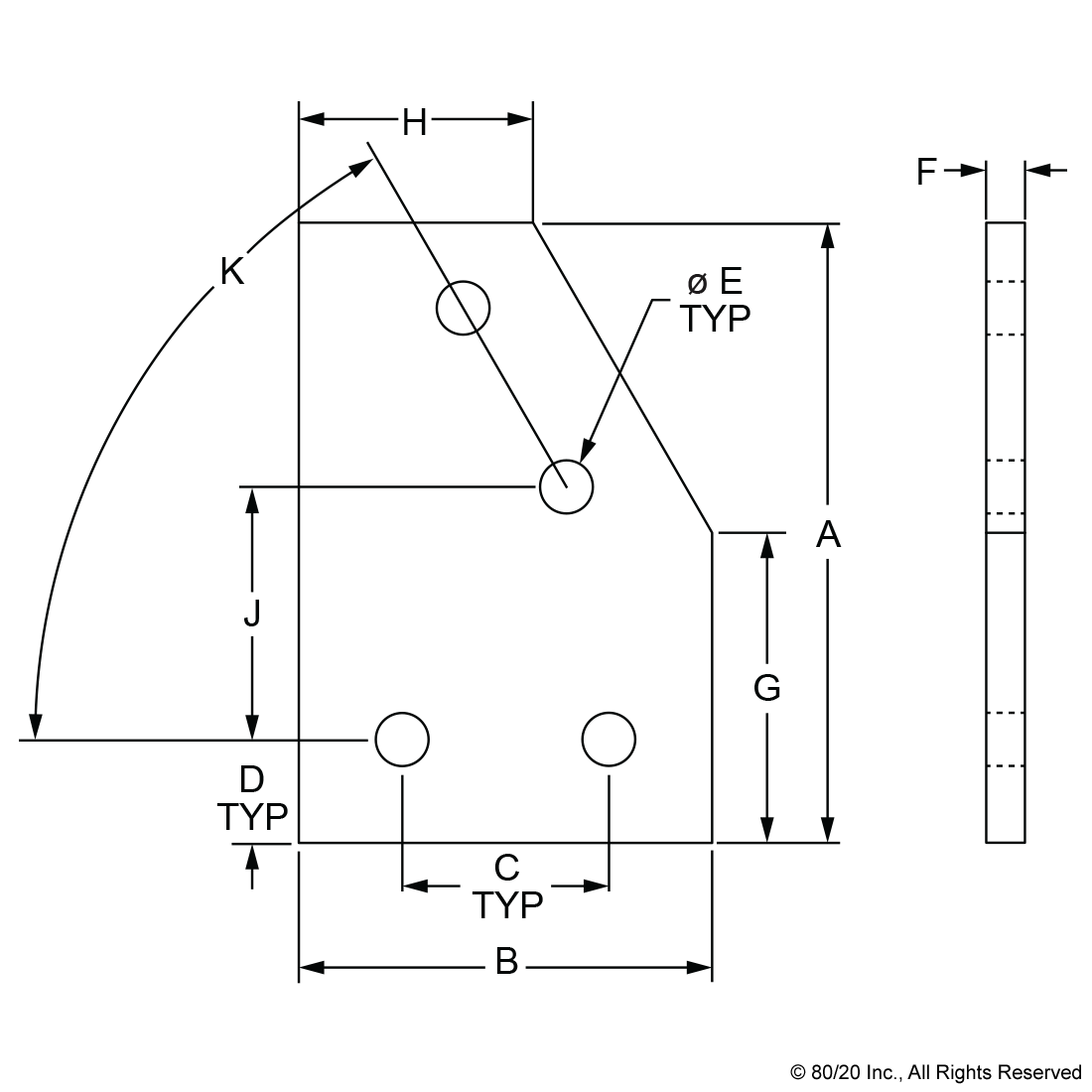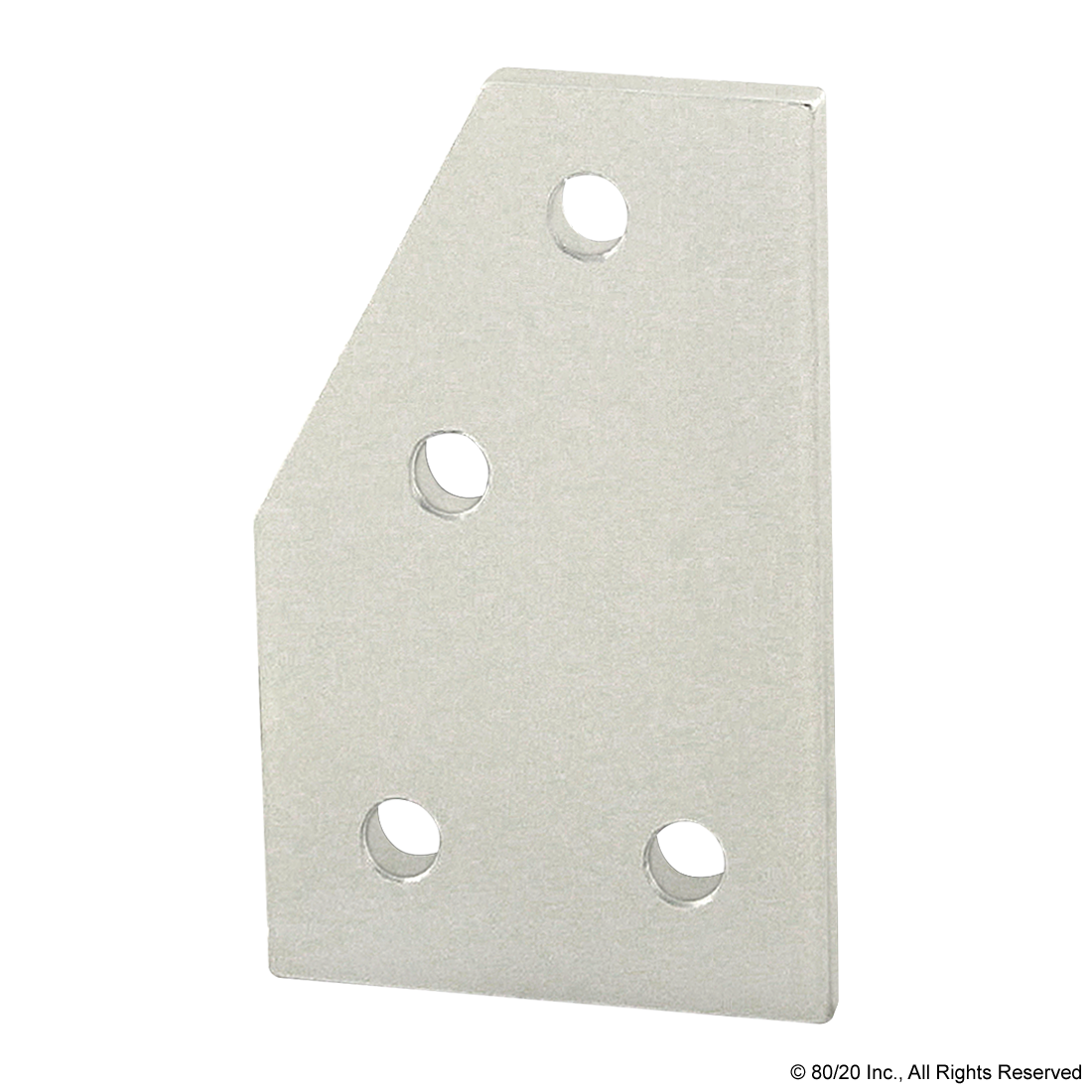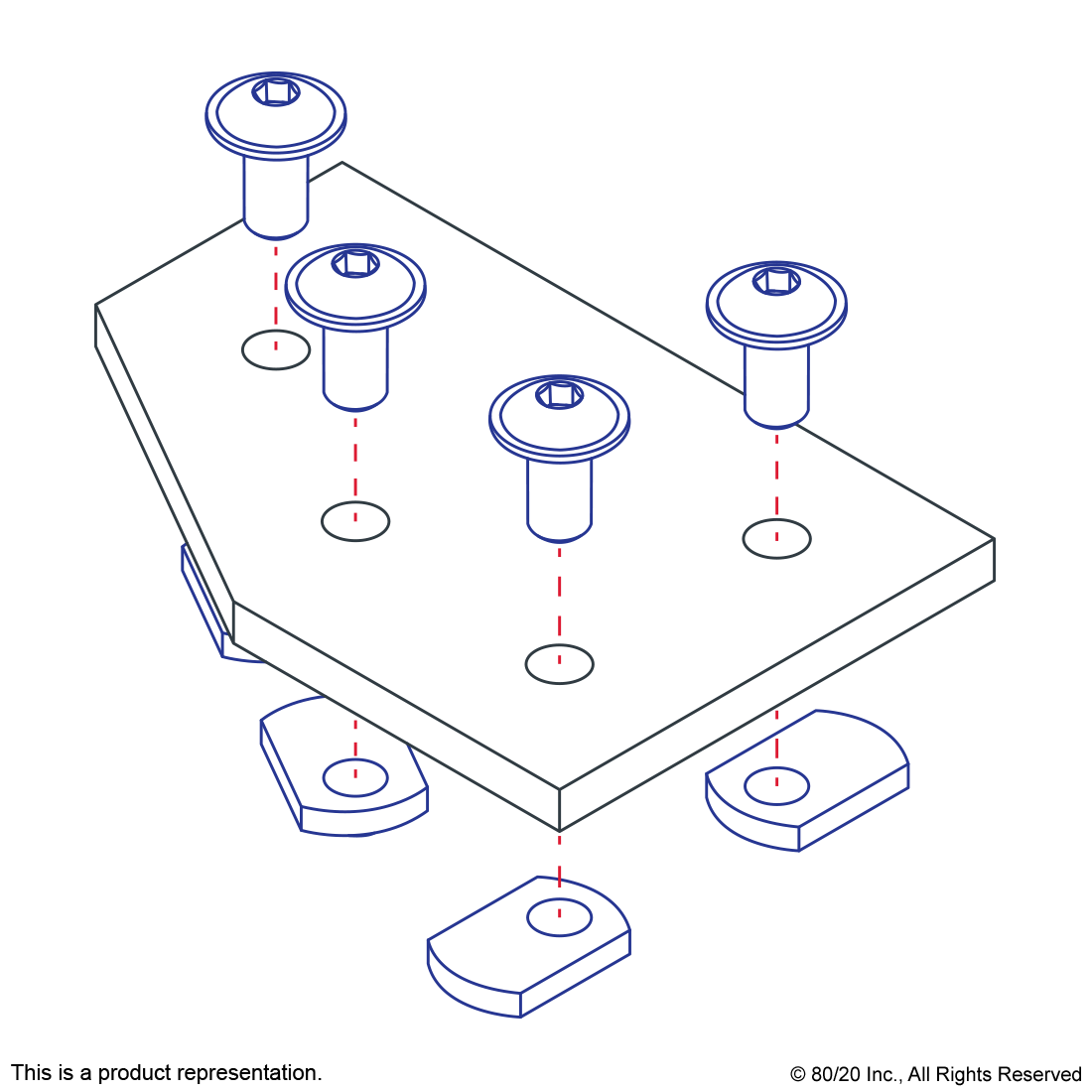 THE 4 HOLE - 60 DEGREE ANGLED FLAT PLATE IS AN EXTERNAL FASTENING METHOD THAT REQUIRES NO MACHINING SERVICES. THIS FLAT PLATE CREATES A 60 DEGREE ANGLE BETWEEN PROFILES AND ITS SHAPE REINFORCES THE STRENGTH OF THE CONNECTION. IT IS A DURABLE OPTION THAT IS EASY TO ASSEMBLE AND CAN BE RECONFIGURED AND REUSED. THE SUGGESTED MOUNTING HARDWARE CAN BE FOUND ON THE "SUGGESTED HARDWARE" TAB. TIP: USE A DOUBLE SLIDE-IN ECONOMY T-NUT TO SAVE TIME AND MONEY. PRE-LOAD YOUR HARDWARE PRIOR TO CONNECTING PROFILES TO SIMPLIFY YOUR ASSEMBLY.