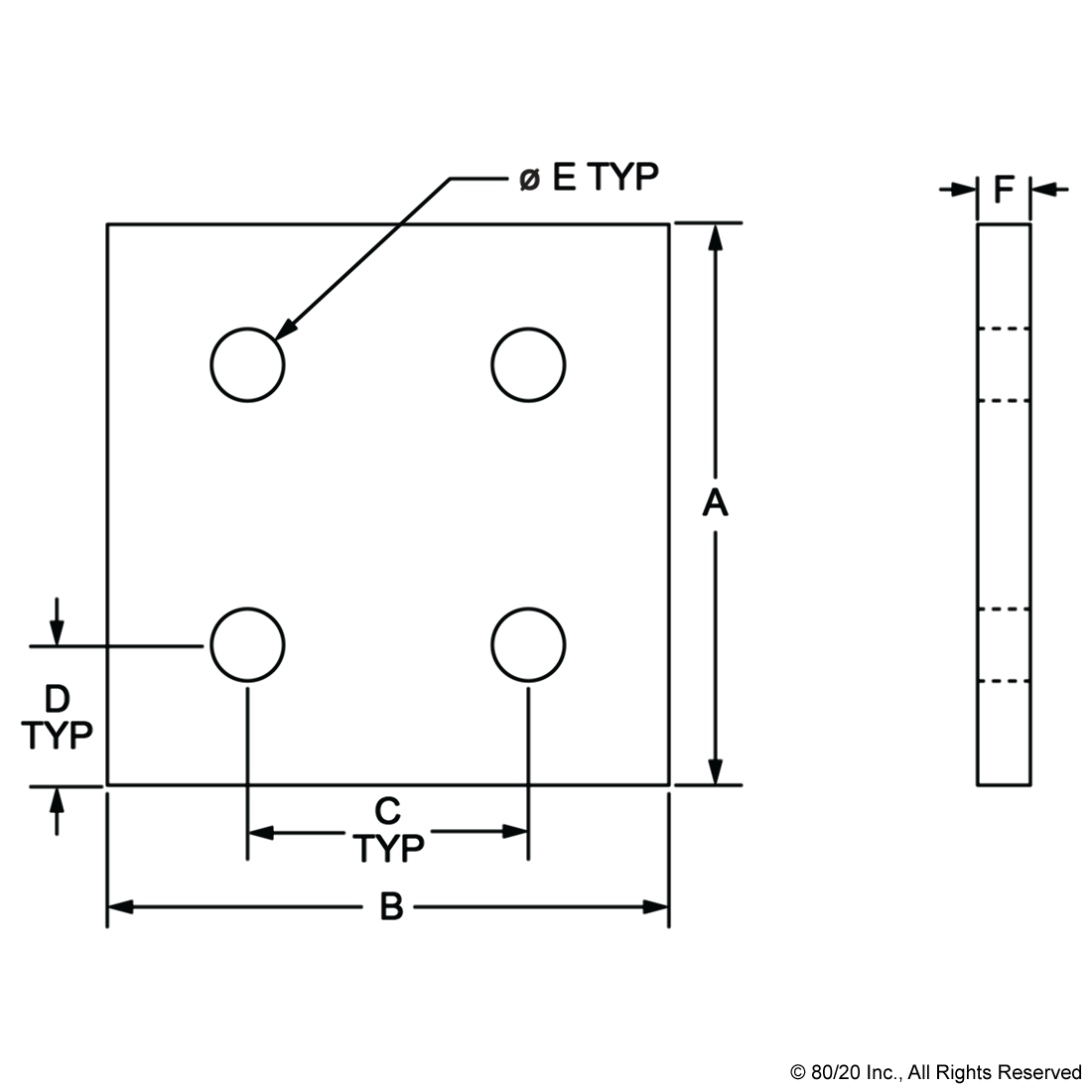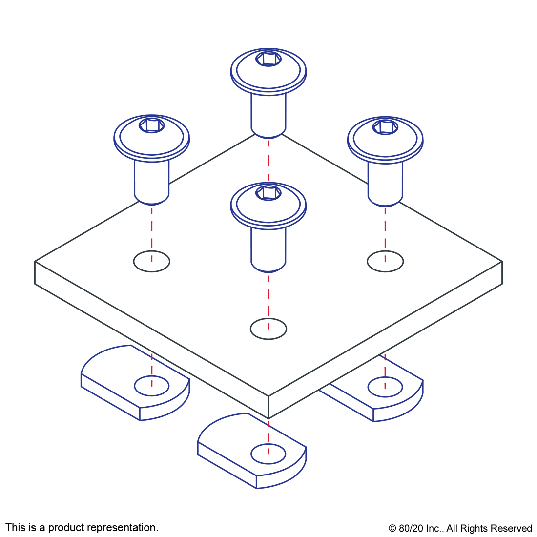 THE 4 HOLE - SQUARE FLAT PLATE IS AN EXTERNAL FASTENING METHOD THAT REQUIRES NO MACHINING SERVICES. IT IS A DURABLE CONNECTION THAT CAN BE REPOSITIONED AND REUSED. THIS CONNECTION CAN PROVIDE INFINITE POSITIONING ALONG THE PROFILE T-SLOT, ALLOWING FOR A LARGE DEGREE OF ADJUSTABILITY. THE 4 HOLE - SQUARE FLAT PLATE ENGAGES THE 2-DEGREE DROP-LOCK FEATURE WHEN THE ASSEMBLY BOLTS ARE TIGHTENED TO THE REQUIRED TORQUE, CREATING A STRONG CONNECTION. TIP: USE A DOUBLE SLIDE-IN ECONOMY T-NUT TO SAVE TIME AND MONEY. PRE-LOAD YOUR HARDWARE PRIOR TO CONNECTING PROFILES TO SIMPLIFY YOUR ASSEMBLY.