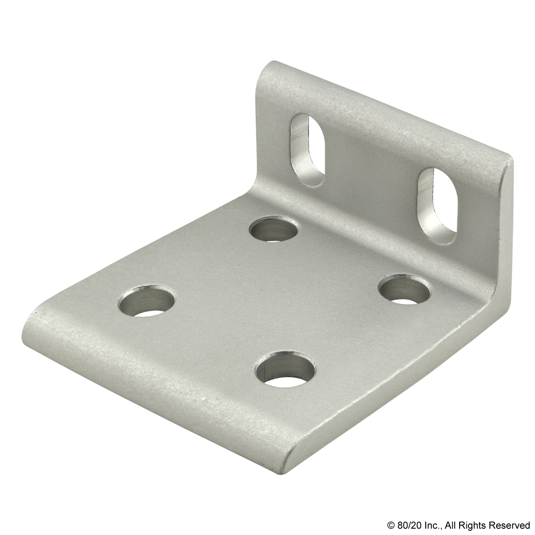 THE 6 HOLE - WIDE 2X4 SLOTTED INSIDE CORNER BRACKET IS AN EXTERNAL FASTENING METHOD THAT CREATES A 90 DEGREE CONNECTION. ONE SIDE OF THE BRACKET HAS TWO ADJACENT HOLES AND THE SECOND SIDE HAS FOUR HOLES COMPRISED OF TWO ROWS AND TWO COLUMNS. THE TWO ADJACENT HOLES ARE SLOTTED, ALLOWING FOR A LARGER DEGREE IN ADJUSTABILITY BETWEEN CONNECTING PROFILES. THIS FASTENER REQUIRES NO MACHINING SERVICES AND CAN PROVIDE INFINITE POSITIONING ALONG THE PROFILE T-SLOT, ALLOWING A LARGE DEGREE OF ADJUSTABILITY. IT ENGAGES THE 2-DEGREE DROP-LOCK FEATURE WHEN THE ASSEMBLY BOLTS ARE TIGHTENED TO THE REQUIRED TORQUE AND CAN ALSO BE REPOSITIONED AND REUSED. THE SUGGESTED MOUNTING HARDWARE CAN BE FOUND ON THE "SUGGESTED HARDWARE" TAB.