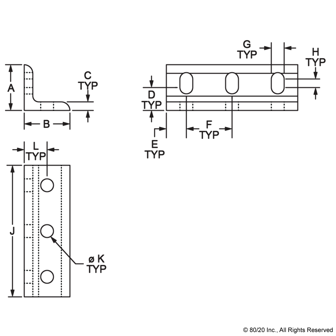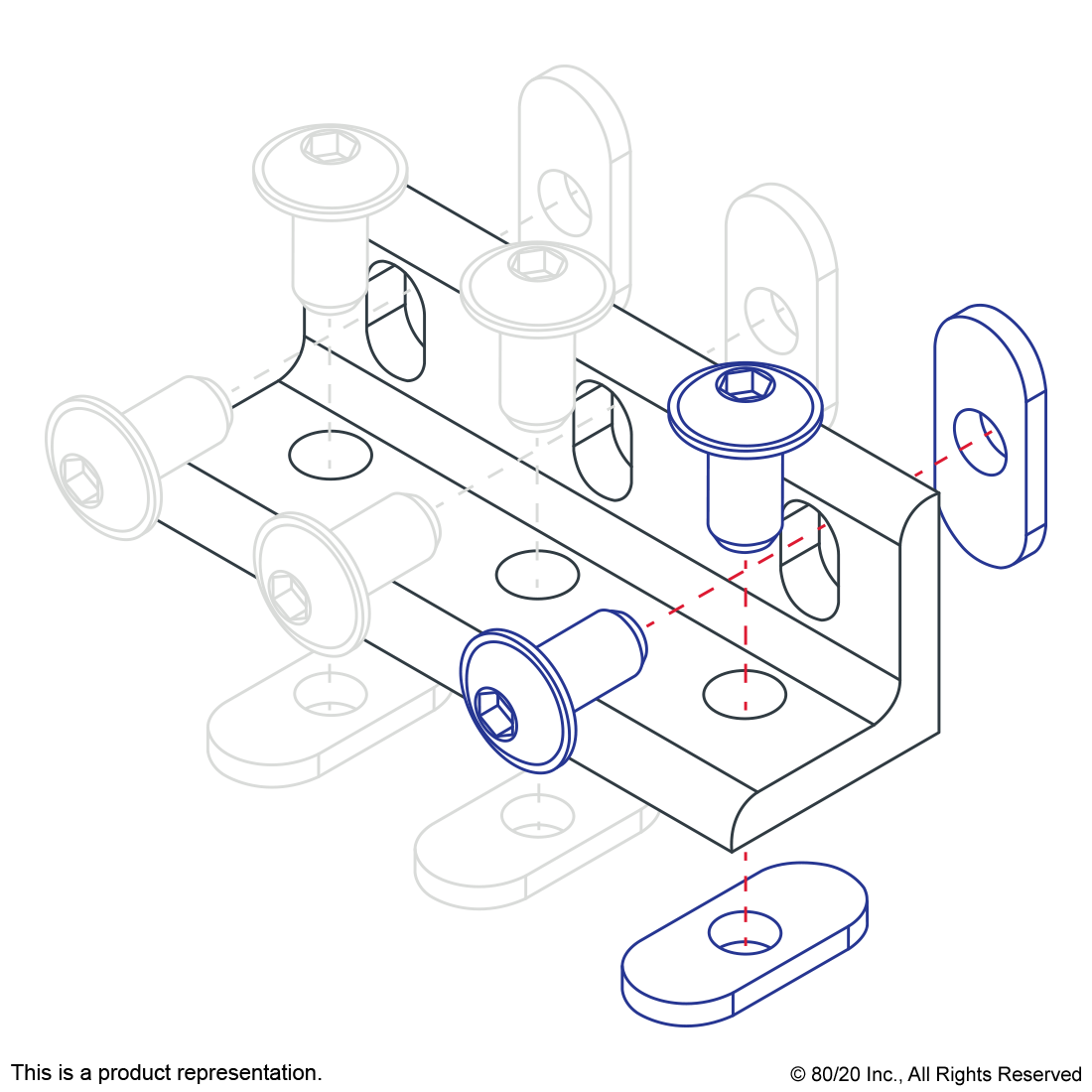THE 6 HOLE - WIDE SLOTTED INSIDE CORNER BRACKET IS AN EXTERNAL FASTENING METHOD THAT CREATES A 90 DEGREE CONNECTION. THERE ARE THREE ADJACENT HOLES ON EACH SIDE OF THE BRACKET. THREE OF THE HOLES ON ONE SIDE ARE SLOTTED, ALLOWING FOR A LARGER DEGREE IN ADJUSTABILITY BETWEEN CONNECTING PROFILES. THIS BRACKET CAN PROVIDE INFINITE POSITIONING ALONG THE PROFILE T-SLOT, ALLOWING A LARGE DEGREE OF ADJUSTABILITY. IT ENGAGES THE 2-DEGREE DROP-LOCK FEATURE WHEN THE ASSEMBLY BOLTS ARE TIGHTENED TO THE REQUIRED TORQUE. IT IS A FASTENING METHOD THAT CAN BE REPOSITIONED AND REUSED. THE SUGGESTED MOUNTING HARDWARE CAN BE FOUND ON THE "SUGGESTED HARDWARE" TAB.