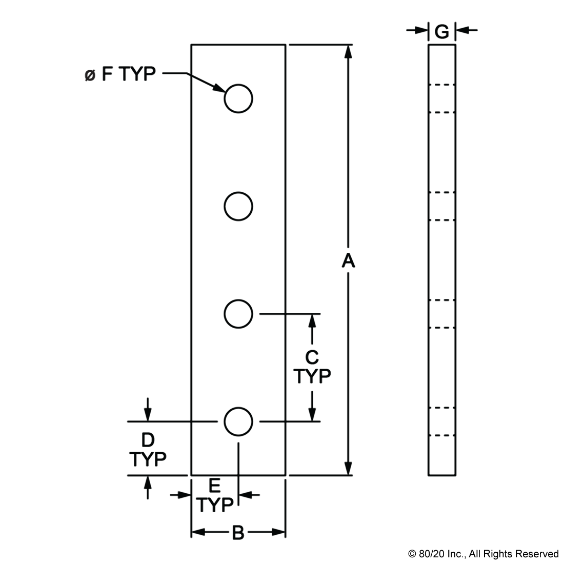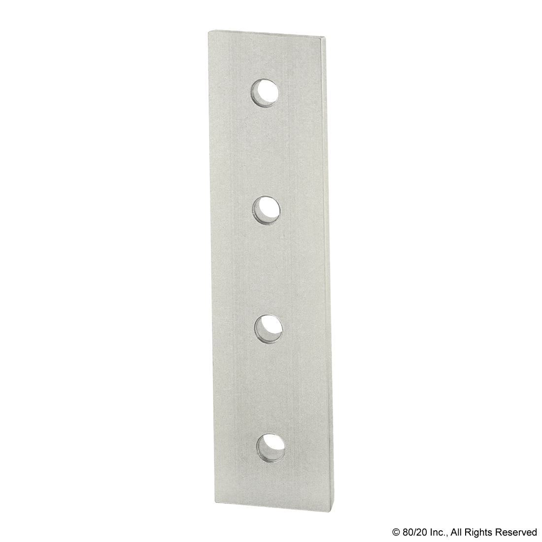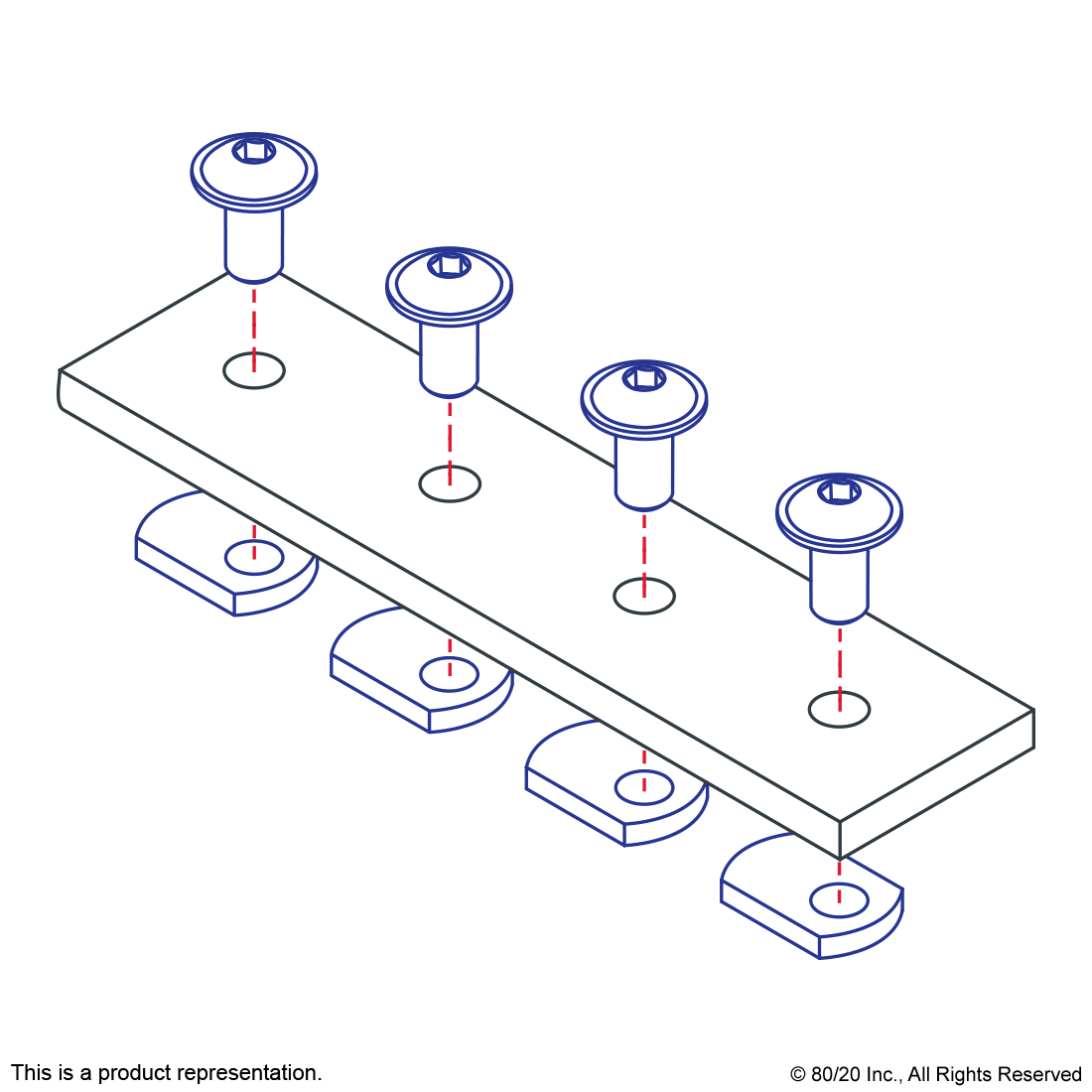THE 4 HOLE - STRAIGHT FLAT PLATE IS AN EXTERNAL FASTENING METHOD THAT REQUIRES NO MACHINING SERVICES. IT IS A DURABLE CONNECTION THAT CAN BE EASILY REPOSITIONED AND REUSED. THIS FLAT PLATE CAN PROVIDE INFINITE POSITIONING ALONG THE PROFILE T-SLOT, ALLOWING FOR A LARGE DEGREE OF ADJUSTABILITY. IT ENGAGES THE 2-DEGREE DROP-LOCK FEATURE WHEN THE ASSEMBLY BOLTS ARE TIGHTENED TO THE REQUIRED TORQUE, CREATING A STRONG CONNECTION. TIP: USE A DOUBLE SLIDE-IN ECONOMY T-NUT TO SAVE TIME AND MONEY. PRE-LOAD YOUR HARDWARE PRIOR TO CONNECTING PROFILES TO SIMPLIFY YOUR ASSEMBLY.