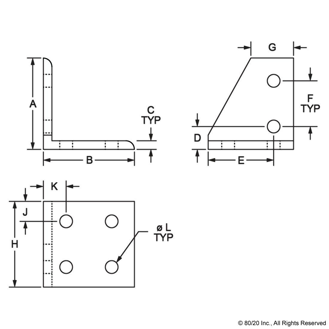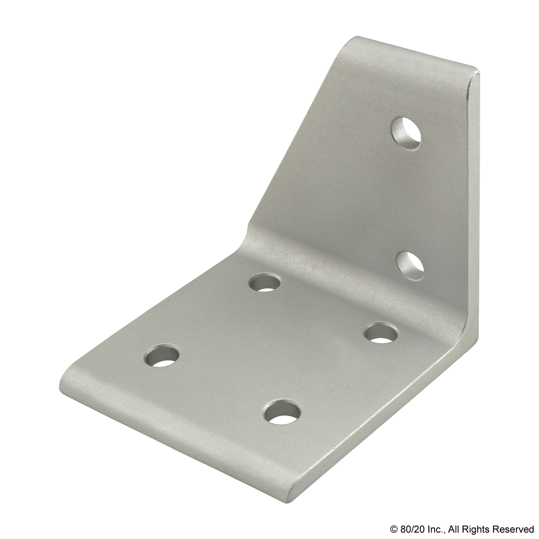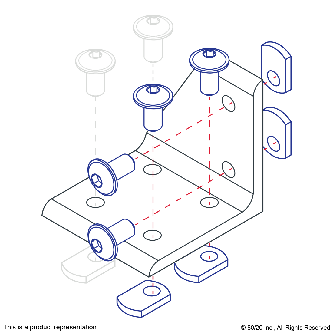 THE 6 HOLE - RIGHT ALIGNED INSIDE CORNER BRACKET IS AN EXTERNAL FASTENING METHOD THAT CREATES A 90 DEGREE CONNECTION. ONE SIDE OF THE BRACKET HAS FOUR HOLES COMPRISED OF TWO ROWS AND TWO COLUMNS WHILE THE SECOND SIDE HAS TWO RIGHT-ALIGNED, STACKED HOLES. THIS BRACKET CAN BE USED TO CONNECT PROFILES THAT ARE WITHIN THE SAME SERIES BUT OF DIFFERENT SIZES. IT REQUIRES NO MACHINING SERVICES AND CAN PROVIDE INFINITE POSITIONING ALONG THE PROFILE T-SLOT, ALLOWING A LARGE DEGREE OF ADJUSTABILITY. THE 6 HOLE - RIGHT ALIGNED INSIDE CORNER BRACKET ENGAGES THE 2-DEGREE DROP-LOCK FEATURE WHEN THE ASSEMBLY BOLTS ARE TIGHTENED TO THE REQUIRED TORQUE. IT IS A FASTENING METHOD THAT CAN BE REPOSITIONED AND REUSED. THE SUGGESTED MOUNTING HARDWARE CAN BE FOUND ON THE "SUGGESTED HARDWARE" TAB.