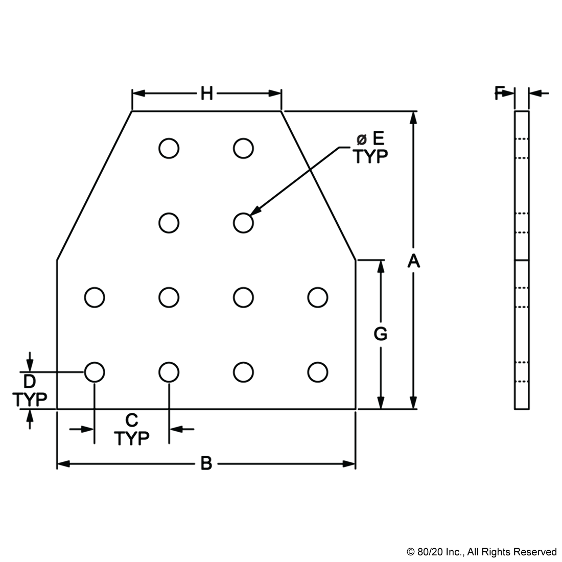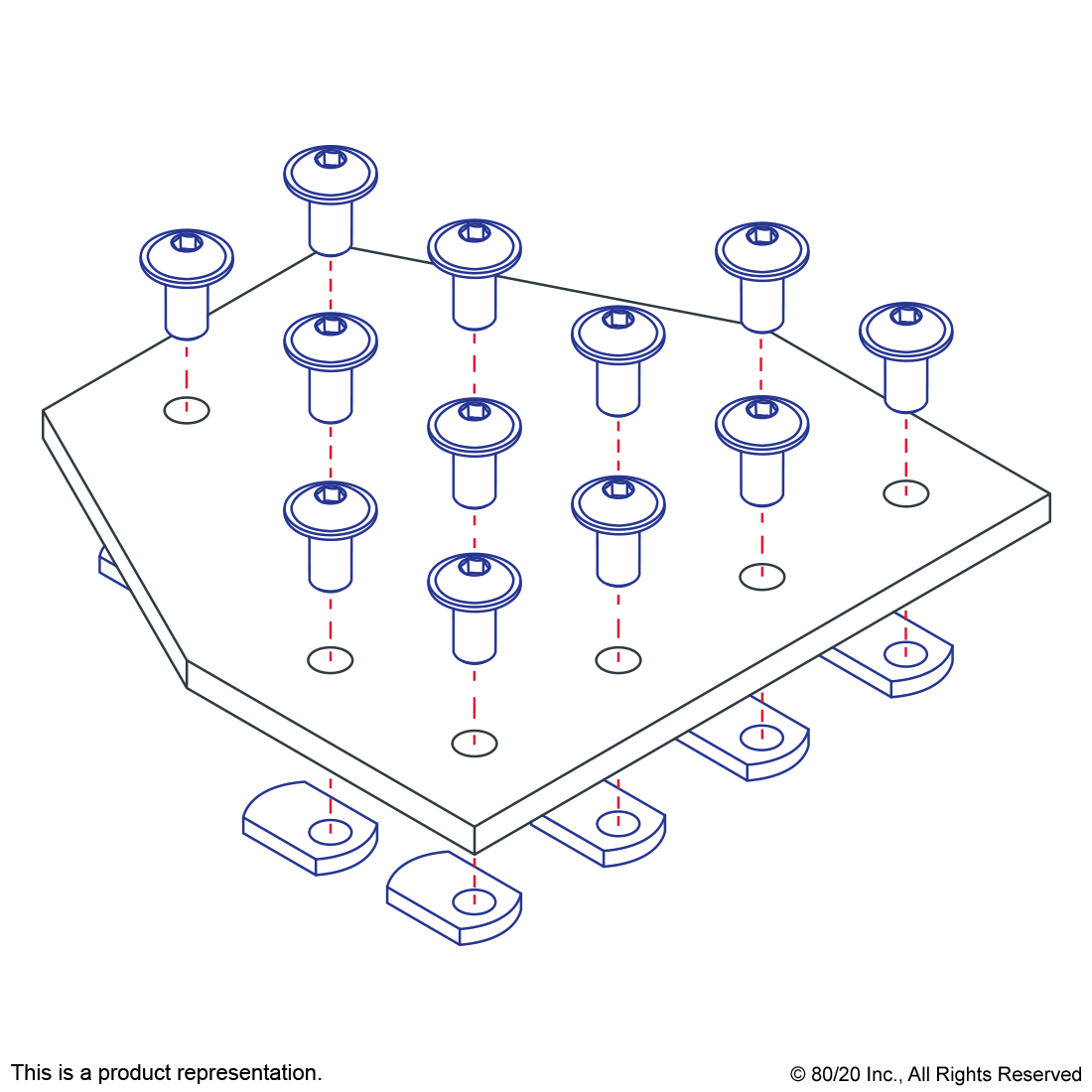 THE 12 HOLE - TEE FLAT PLATE IS A STRONG, EXTERNAL FASTENING METHOD THAT REQUIRES NO MACHINING SERVICES AND CAN BE USED TO CONNECT MORE THAN TWO PROFILES TOGETHER. THIS FASTENING OPTION CAN PROVIDE INFINITE POSITIONING ALONG THE PROFILE T-SLOT, ALLOWING FOR A LARGE DEGREE OF ADJUSTABILITY. IT IS A LONG-LASTING CONNECTION THAT IS EASILY ASSEMBLED AND CAN BE REPOSITIONED AND REUSED. THE SUGGESTED MOUNTING HARDWARE CAN BE FOUND ON THE "SUGGESTED HARDWARE" TAB. TIP: USE DOUBLE OR TRIPLE SLIDE-IN ECONOMY T-NUTS TO SAVE TIME AND MONEY. PRE-LOAD YOUR HARDWARE PRIOR TO CONNECTING PROFILES TO SIMPLIFY YOUR ASSEMBLY.