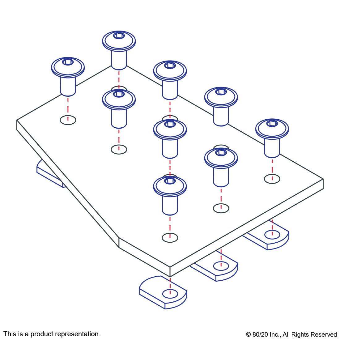THE 10 HOLE - 90 DEGREE ANGLED FLAT PLATE IS AN EXTERNAL FASTENING METHOD THAT REQUIRES NO MACHINING SERVICES. THIS FLAT PLATE CREATES A 90-DEGREE ANGLE BETWEEN PROFILES AND ITS SHAPE REINFORCES THE STRENGTH OF THE CONNECTION. IT IS A DURABLE OPTION THAT IS EASY TO ASSEMBLE AND CAN BE RECONFIGURED AND REUSED. THE SUGGESTED MOUNTING HARDWARE CAN BE FOUND ON THE "SUGGESTED HARDWARE" TAB. TIP: USE DOUBLE OR TRIPLE SLIDE-IN ECONOMY T-NUTS TO SAVE TIME AND MONEY. PRE-LOAD YOUR HARDWARE PRIOR TO CONNECTING PROFILES TO SIMPLIFY YOUR ASSEMBLY.