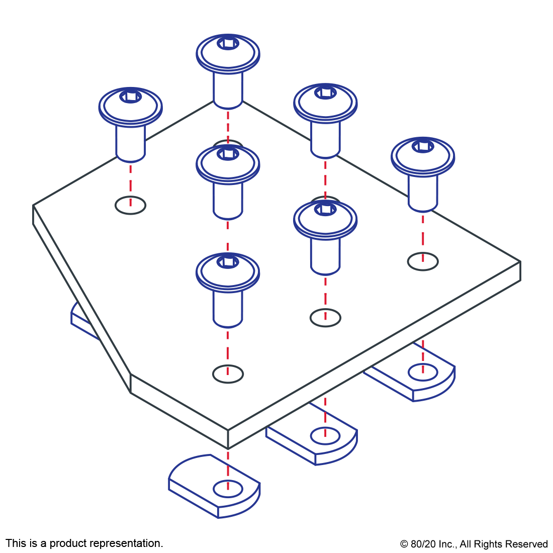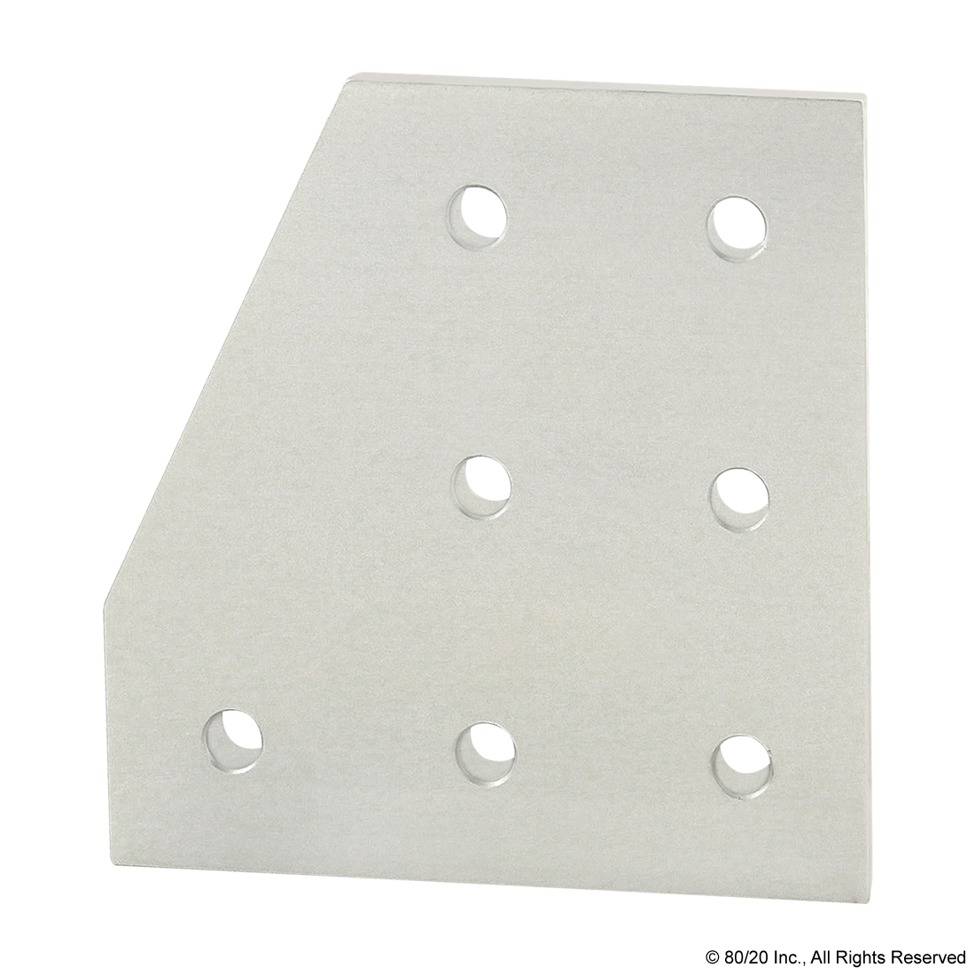 THE 7 HOLE - 90 DEGREE ANGLED STACKED FLAT PLATE IS AN EXTERNAL FASTENING METHOD THAT REQUIRES NO MACHINING SERVICES. THIS FLAT PLATE CREATES A 90-DEGREE ANGLE BETWEEN PROFILES AND ITS SHAPE REINFORCES THE STRENGTH OF THE CONNECTION. IT IS A DURABLE OPTION THAT IS EASY TO ASSEMBLE AND CAN BE RECONFIGURED AND REUSED. THE SUGGESTED MOUNTING HARDWARE CAN BE FOUND ON THE "SUGGESTED HARDWARE" TAB. TIP: USE DOUBLE OR TRIPLE SLIDE-IN ECONOMY T-NUTS TO SAVE TIME AND MONEY. PRE-LOAD YOUR HARDWARE PRIOR TO CONNECTING PROFILES TO SIMPLIFY YOUR ASSEMBLY.