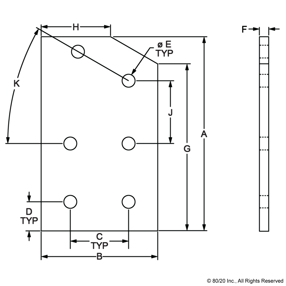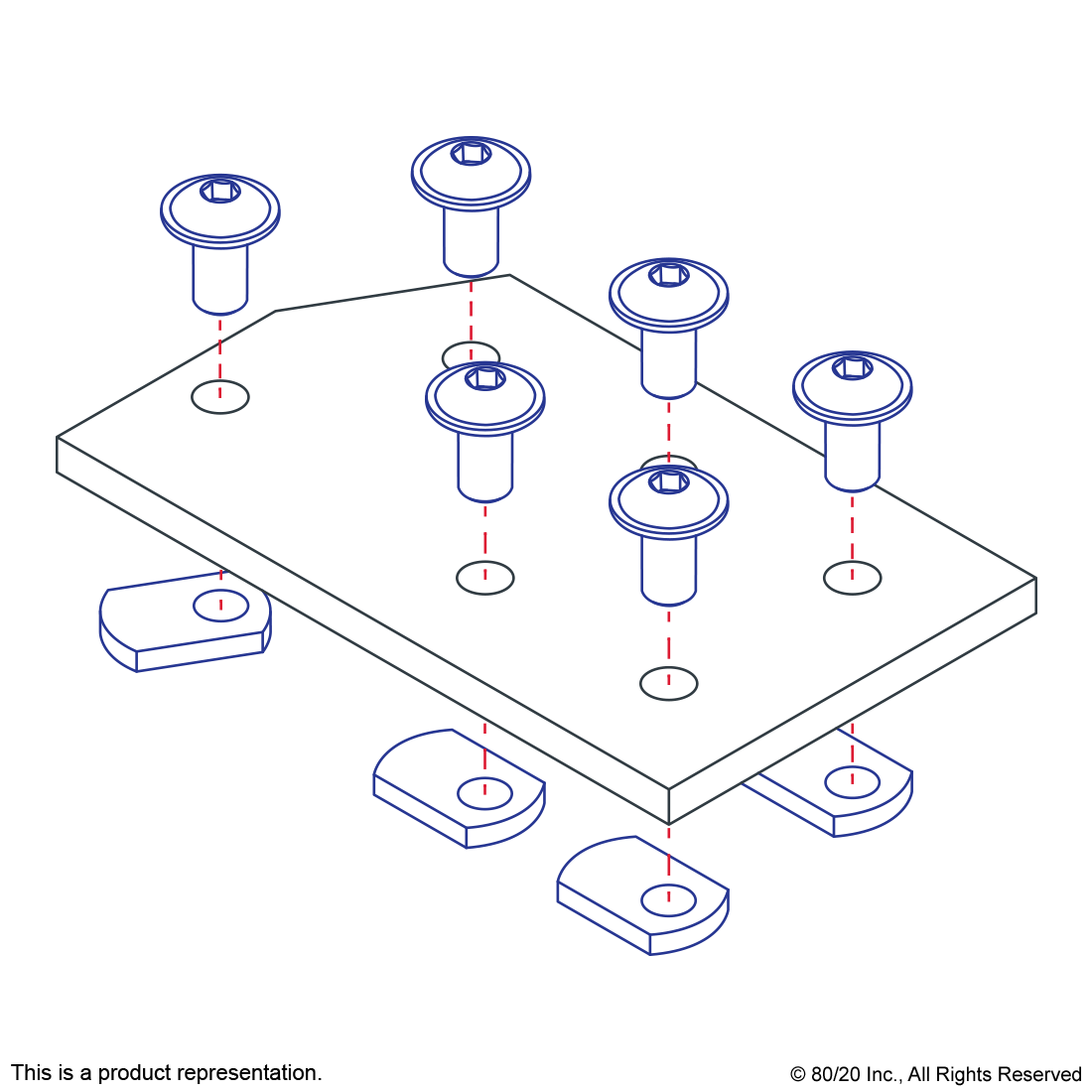 THE 6 HOLE - 30 DEGREE ANGLED FLAT PLATE IS AN EXTERNAL FASTENING METHOD THAT REQUIRES NO MACHINING SERVICES. THIS FLAT PLATE CREATES A 30 DEGREE ANGLE BETWEEN PROFILES AND ITS SHAPE REINFORCES THE STRENGTH OF THE CONNECTION. IT IS A DURABLE OPTION THAT IS EASY TO ASSEMBLE AND CAN BE RECONFIGURED AND REUSED. THE SUGGESTED MOUNTING HARDWARE CAN BE FOUND ON THE "SUGGESTED HARDWARE" TAB. TIP: USE A DOUBLE SLIDE-IN ECONOMY T-NUT TO SAVE TIME AND MONEY. PRE-LOAD YOUR HARDWARE PRIOR TO CONNECTING PROFILES TO SIMPLIFY YOUR ASSEMBLY.