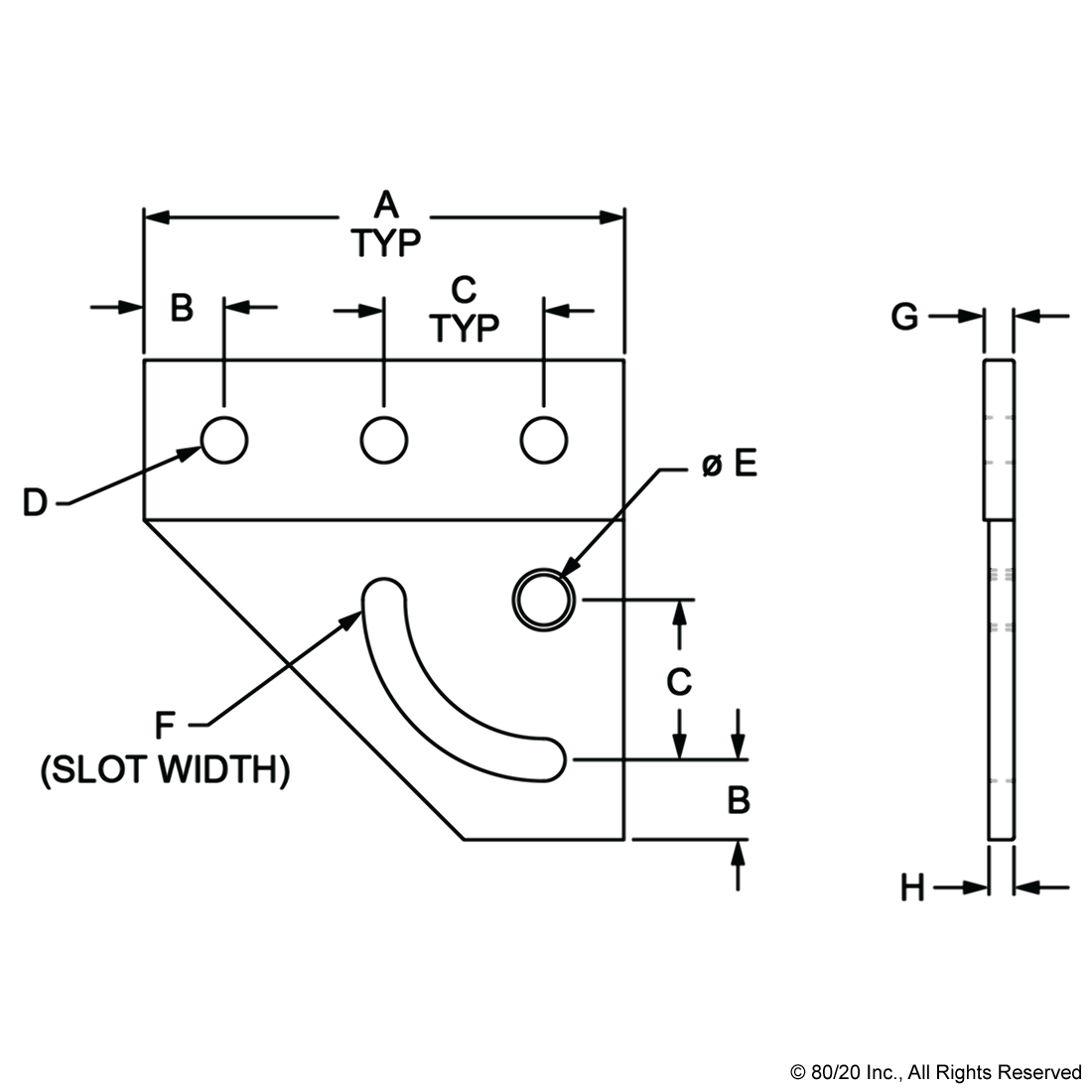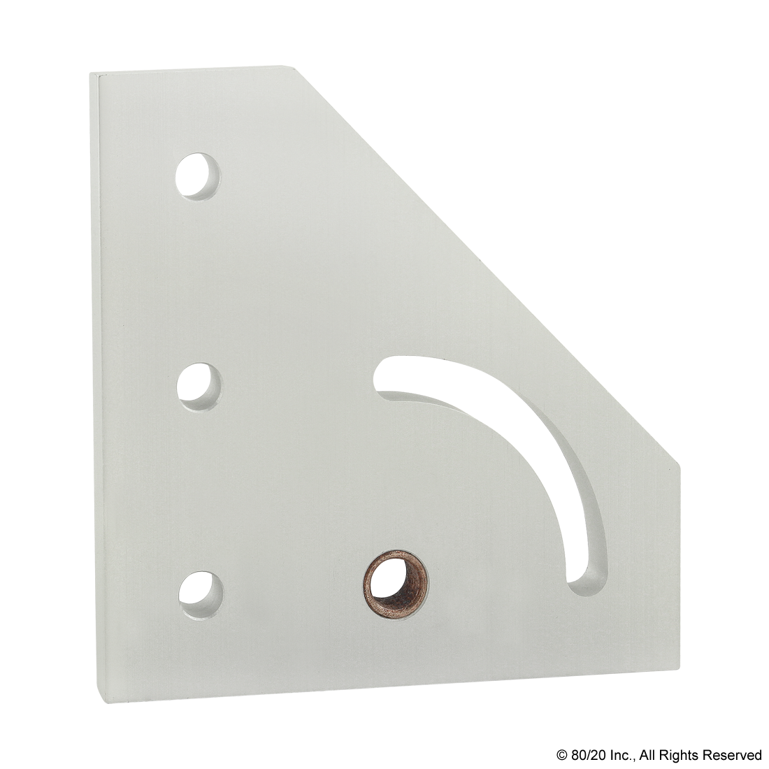 THE 90 DEGREE RIGHT HAND PIVOT BRACKET PLATE IS COMMONLY USED TO ADD MOTION TO CERTAIN ELEMENTS OF YOUR PROJECT. THE PLATE PROVIDES A FULL 90 DEGREES OF AXIAL MOTION AND HAS A PERMANENTLY LUBRICATED BRONZE BUSHINGS THAT ACT AS A HIGH-STRENGTH PIVOT POINT. THE SUGGESTED HARDWARE TO MOUNT THE PLATE TO A PROFILE CAN BE FOUND ON THE "SUGGESTED HARDWARE" TAB.