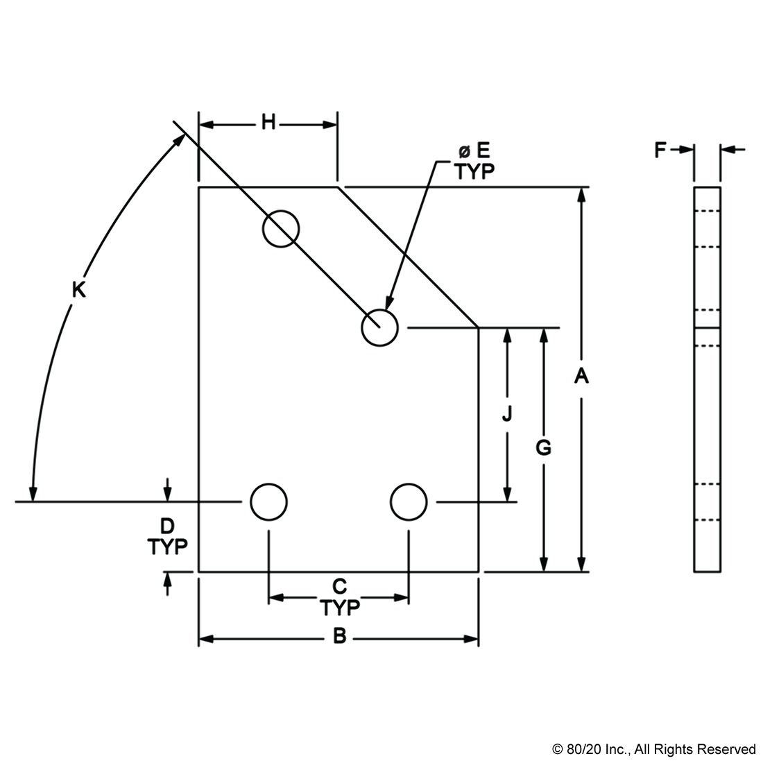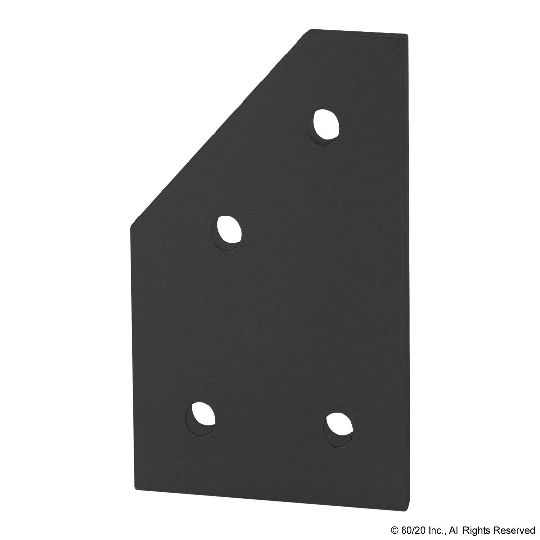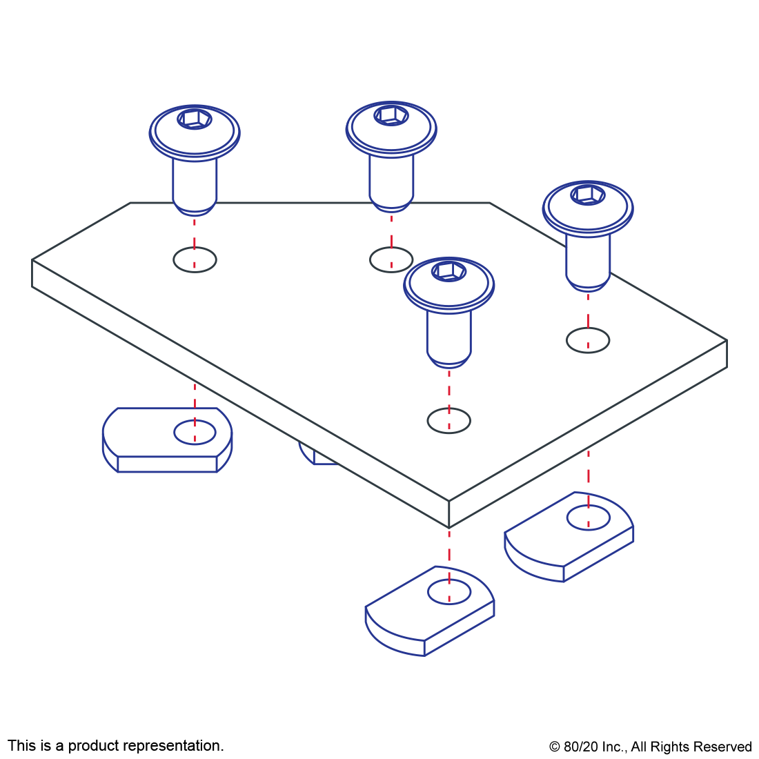 THE 4 HOLE - 45 DEGREE ANGLED FLAT PLATE IS AN EXTERNAL FASTENING METHOD THAT REQUIRES NO MACHINING SERVICES. THIS FLAT PLATE CREATES A 45 DEGREE ANGLE BETWEEN PROFILES AND ITS SHAPE REINFORCES THE STRENGTH OF THE CONNECTION. IT IS A DURABLE OPTION THAT IS EASY TO ASSEMBLE AND CAN BE RECONFIGURED AND REUSED. THE SUGGESTED MOUNTING HARDWARE CAN BE FOUND ON THE "SUGGESTED HARDWARE" TAB. TIP: USE A DOUBLE SLIDE-IN ECONOMY T-NUT TO SAVE TIME AND MONEY. PRE-LOAD YOUR HARDWARE PRIOR TO CONNECTING PROFILES TO SIMPLIFY YOUR ASSEMBLY.