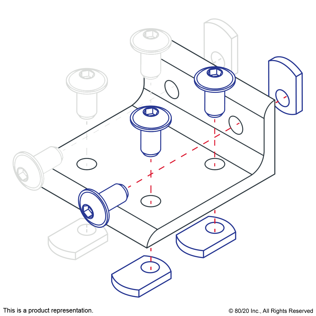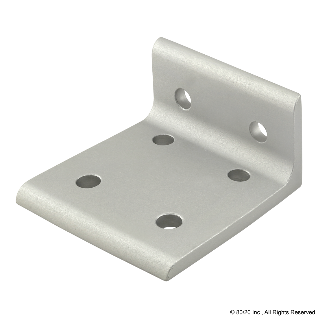 THE 6 HOLE - WIDE 2X4 INSIDE CORNER BRACKET IS AN EXTERNAL FASTENING METHOD THAT CREATES A 90 DEGREE CONNECTION. ONE SIDE OF THE BRACKET HAS TWO ADJACENT HOLES AND THE SECOND SIDE HAS FOUR HOLES COMPRISED OF TWO ROWS AND TWO COLUMNS. THIS FASTENER REQUIRES NO MACHINING SERVICES AND CAN PROVIDE INFINITE POSITIONING ALONG THE PROFILE T-SLOT, ALLOWING A LARGE DEGREE OF ADJUSTABILITY. IT ENGAGES THE 2-DEGREE DROP-LOCK FEATURE WHEN THE ASSEMBLY BOLTS ARE TIGHTENED TO THE REQUIRED TORQUE AND CAN ALSO BE REPOSITIONED AND REUSED. THE SUGGESTED MOUNTING HARDWARE CAN BE FOUND ON THE "SUGGESTED HARDWARE" TAB. ,