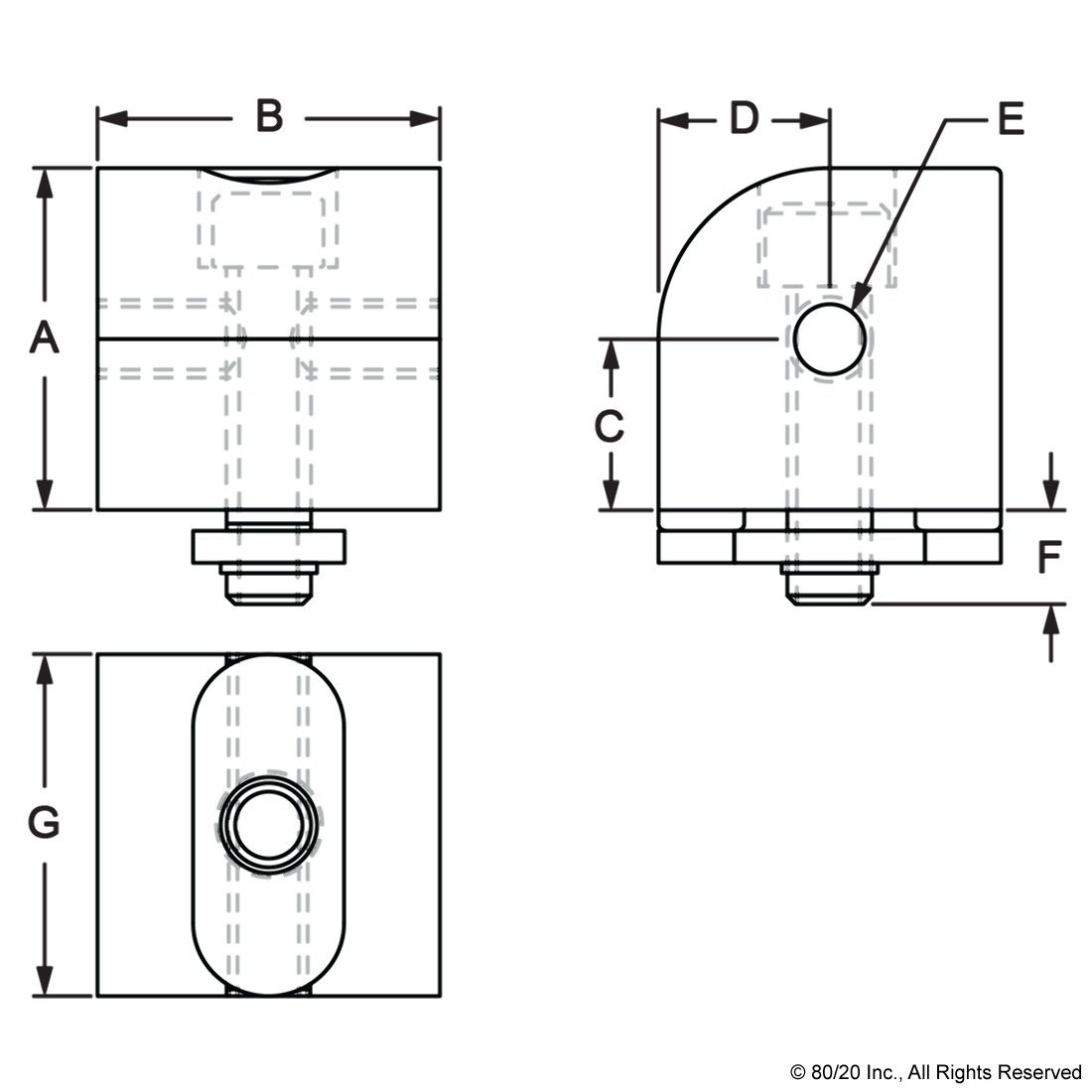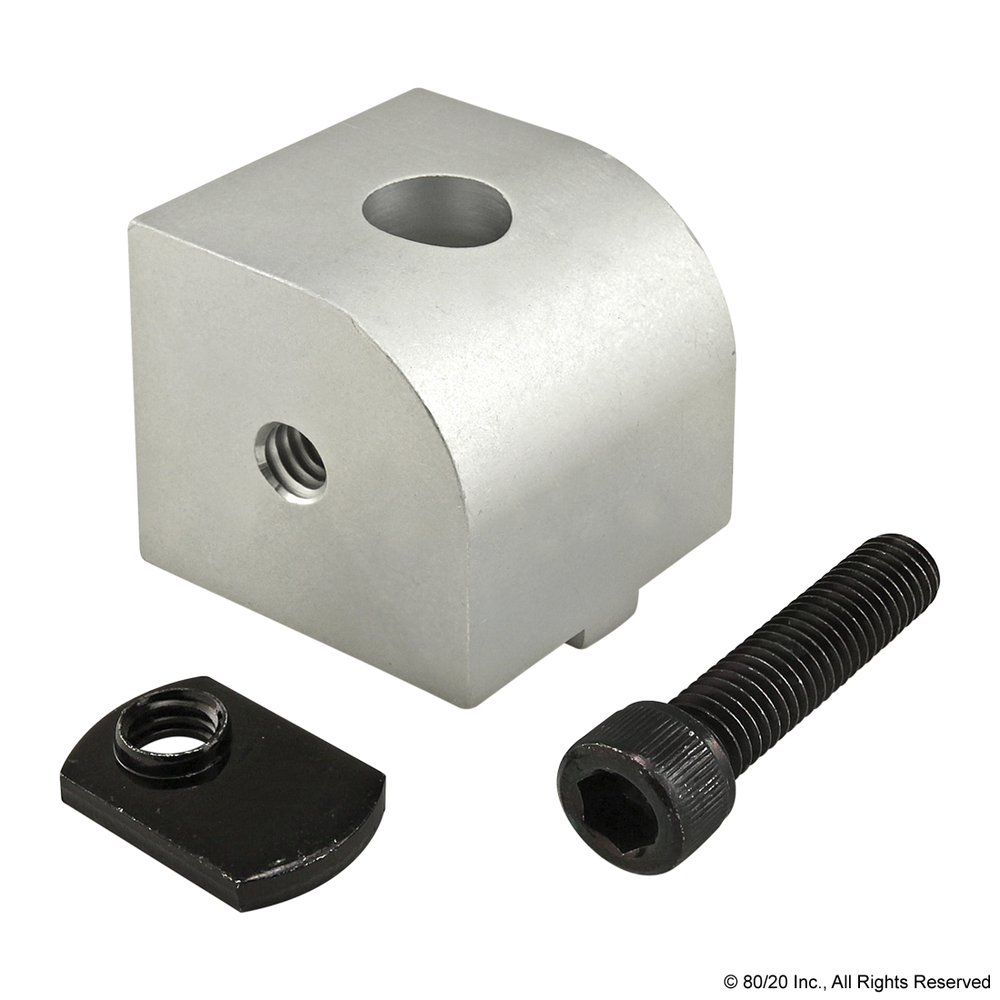 THE 0 DEGREE STRUCTURAL RIGHT ANGLE PIVOT NUB IS AN EXTERNAL FASTENING METHOD COMMONLY USED AS A CONNECTION HUB TO CREATE A STRUCTURAL PIVOT RANGING FROM 0-90 DEGREES PARALLEL TO THE MOUNTING PROFILE. IT HAS A SLOT TAB THAT HELPS PREVENT THE NUB FROM ROTATING AS WELL AS ASSISTS WITH ALIGNMENT IN THE T-SLOT. THE 0 DEGREE STRUCTURAL RIGHT ANGLE PIVOT NUB REQUIRES NO MACHINING SERVICES AND CAN BE EASILY ASSEMBLED, LENDING ITSELF TO REPOSITIONING AND REUSE. THE SUGGESTED MOUNTING HARDWARE CAN BE FOUND ON THE "SUGGESTED HARDWARE" TAB.,