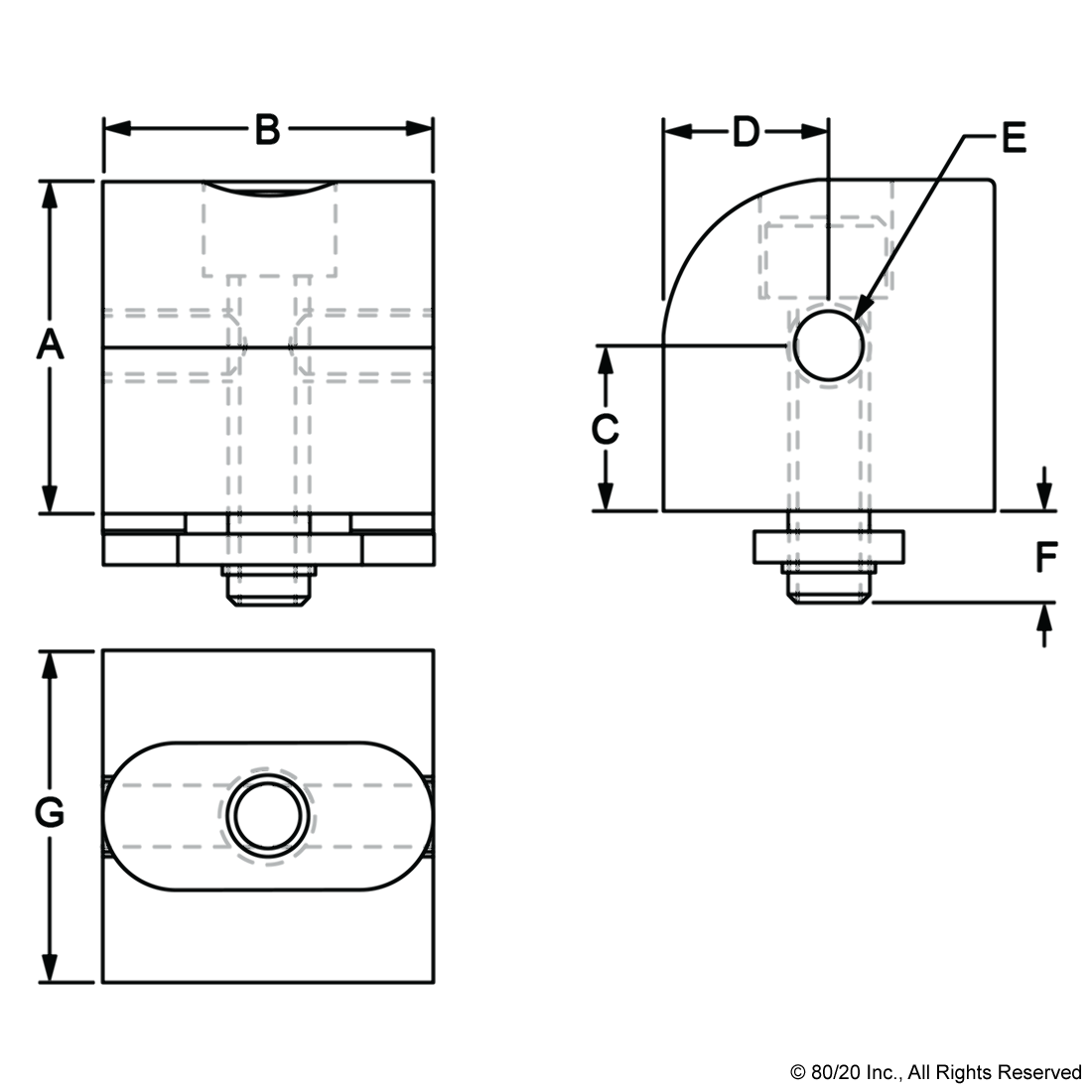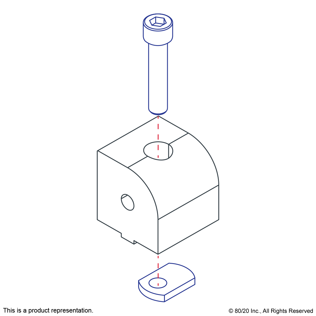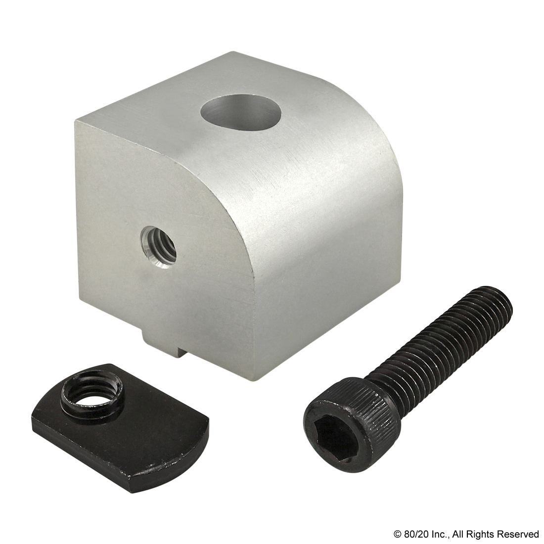 THE 90 DEGREE STRUCTURAL RIGHT ANGLE PIVOT NUB IS AN EXTERNAL FASTENING METHOD COMMONLY USED AS A CONNECTION HUB TO CREATE A STRUCTURAL PIVOT RANGING FROM 0-90 DEGREES PERPENDICULAR TO THE MOUNTING PROFILE. IT HAS A SLOT TAB THAT HELPS PREVENT THE NUB FROM ROTATING AS WELL AS ASSISTS WITH ALIGNMENT IN THE T-SLOT. THE 90 DEGREE STRUCTURAL RIGHT ANGLE PIVOT NUB REQUIRES NO MACHINING SERVICES AND CAN BE EASILY ASSEMBLED, LENDING ITSELF TO REPOSITIONING AND REUSE. THE SUGGESTED MOUNTING HARDWARE CAN BE FOUND ON THE "SUGGESTED HARDWARE" TAB. ,