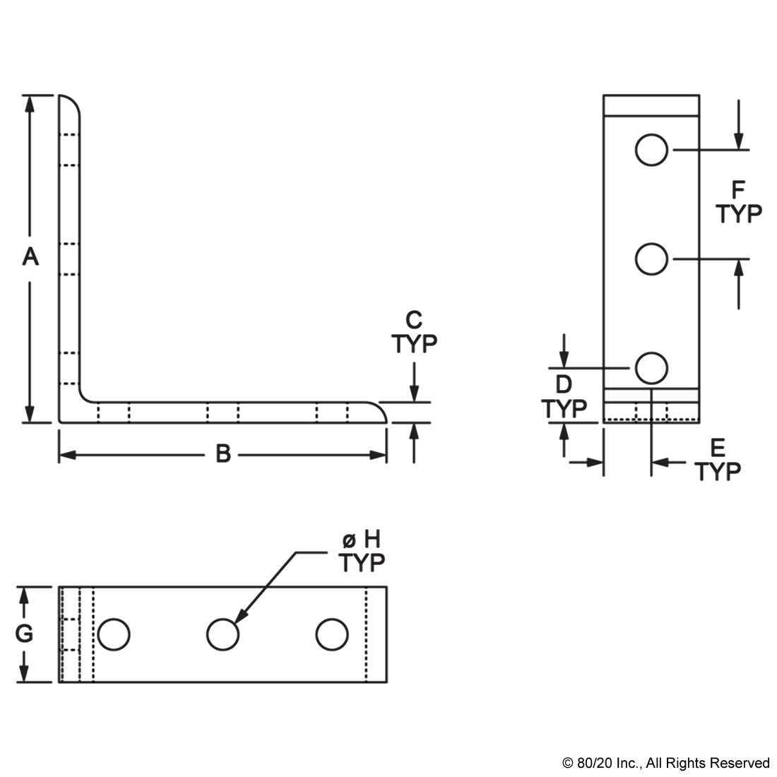 THE 6 HOLE - TALL INSIDE CORNER BRACKET IS AN EXTERNAL FASTENING METHOD THAT CREATES A 90 DEGREE CONNECTION. EACH SIDE OF THE BRACKET HAS THREE HOLES STACKED ONE ON TOP OF THE OTHER. THIS FASTENER REQUIRES NO MACHINING SERVICES AND CAN PROVIDE INFINITE POSITIONING ALONG THE PROFILE T-SLOT, ALLOWING A LARGE DEGREE OF ADJUSTABILITY. THE 6 HOLE - TALL INSIDE CORNER BRACKET ENGAGES THE 2-DEGREE DROP-LOCK FEATURE WHEN THE ASSEMBLY BOLTS ARE TIGHTENED TO THE REQUIRED TORQUE. IT IS A FASTENING METHOD THAT CAN BE REPOSITIONED AND REUSED. THE SUGGESTED MOUNTING HARDWARE CAN BE FOUND ON THE "SUGGESTED HARDWARE" TAB. ,